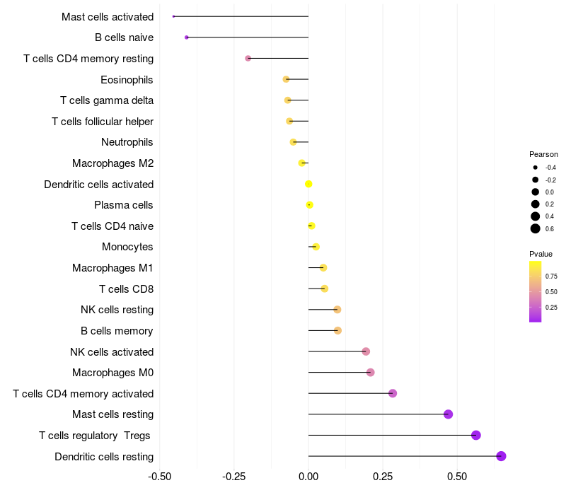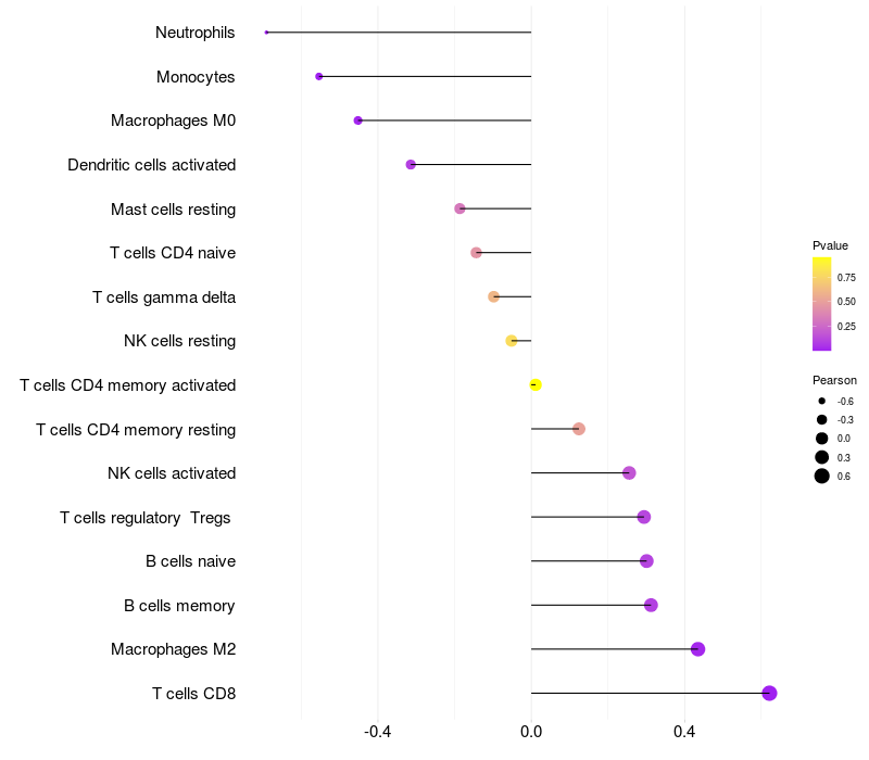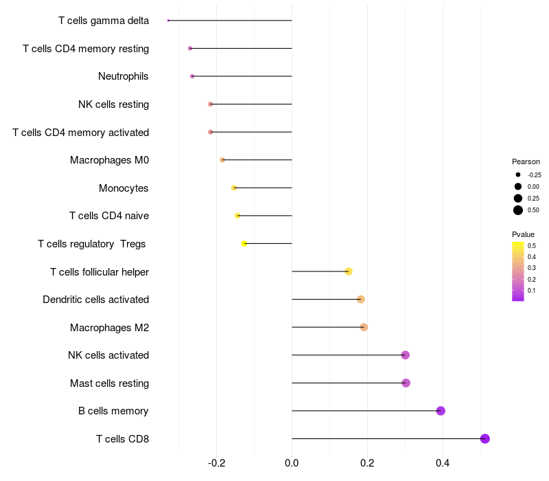 Lollipop of NAT10 expression and immune infiltrating cell level correlation result in HTLV1+ samples