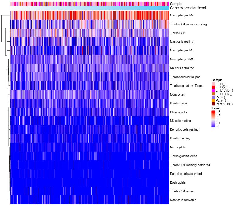 Liver hepatocellular carcinoma HCV (HBV+)(86), Liver hepatocellular carcinoma HCV (HBV-)(19), Liver hepatocellular carcinoma (HBV+)(209), Liver hepatocellular carcinoma (HBV+)(60), Paracancerous HCV (HBV+)(4), Paracancerous (HBV-)(28), Paracancerous (HBV+)(18) |