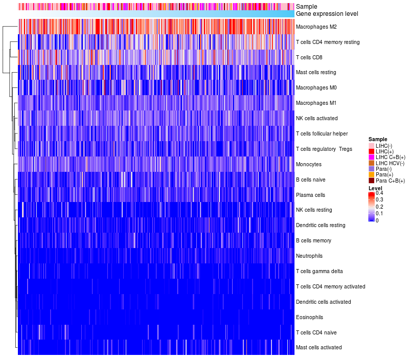 Liver hepatocellular carcinoma HCV (HBV+)(86), Liver hepatocellular carcinoma HCV (HBV-)(19), Liver hepatocellular carcinoma (HBV+)(209), Liver hepatocellular carcinoma (HBV+)(60), Paracancerous HCV (HBV+)(4), Paracancerous (HBV-)(28), Paracancerous (HBV+)(18) |