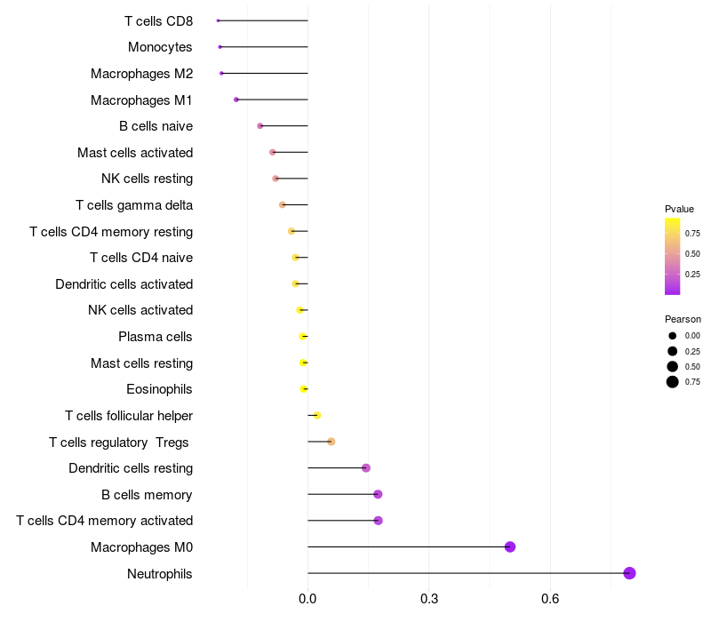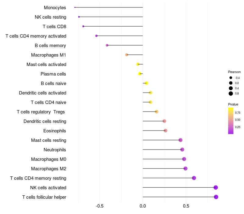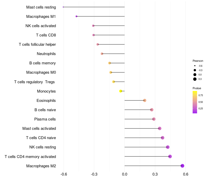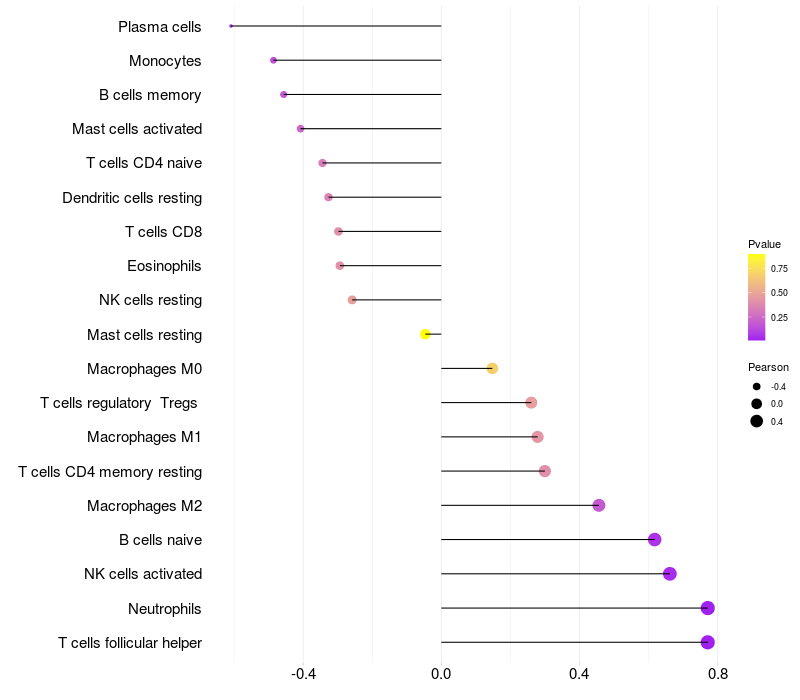 Lollipop of NAV3 expression and immune infiltrating cell level correlation result in HBV+ Liver cirrhosis samples