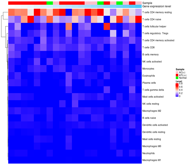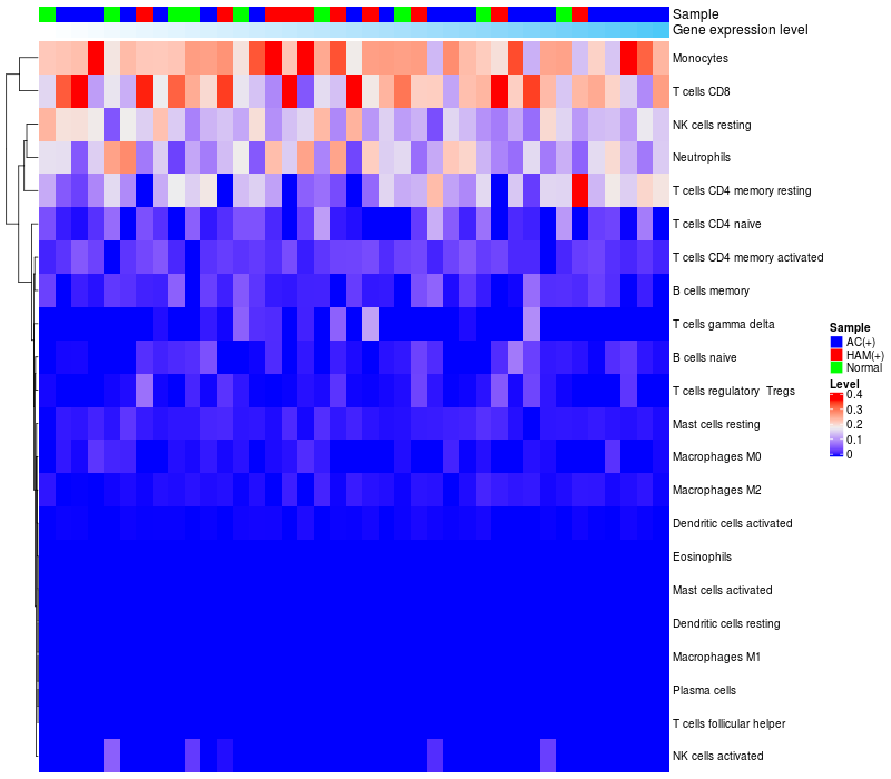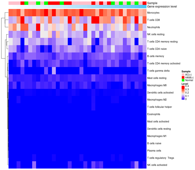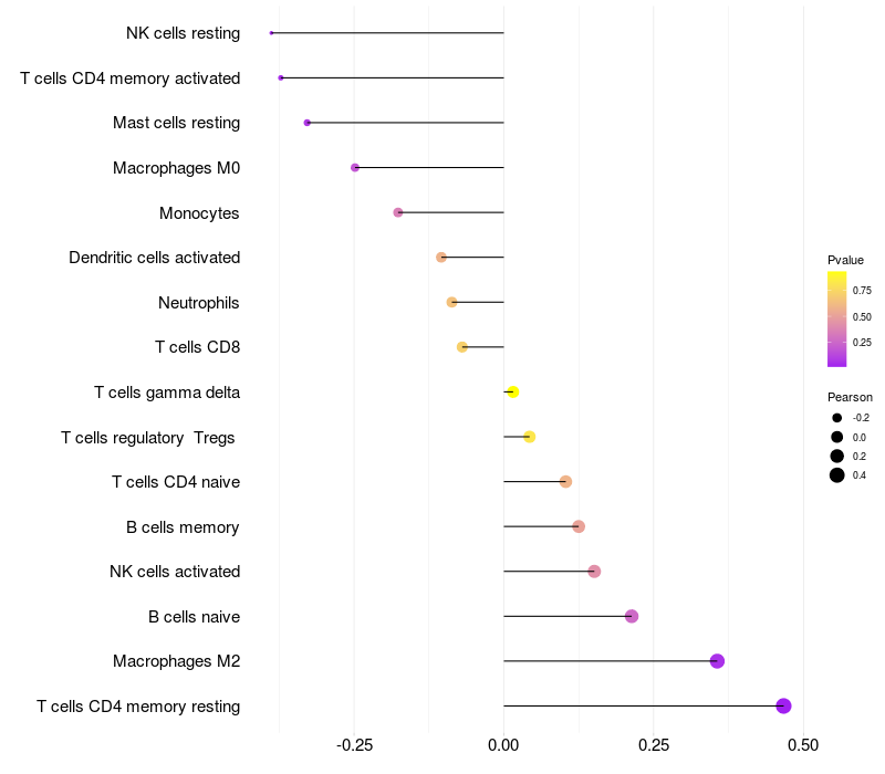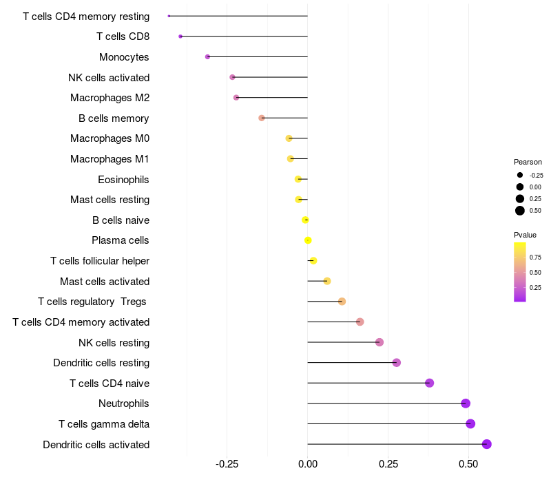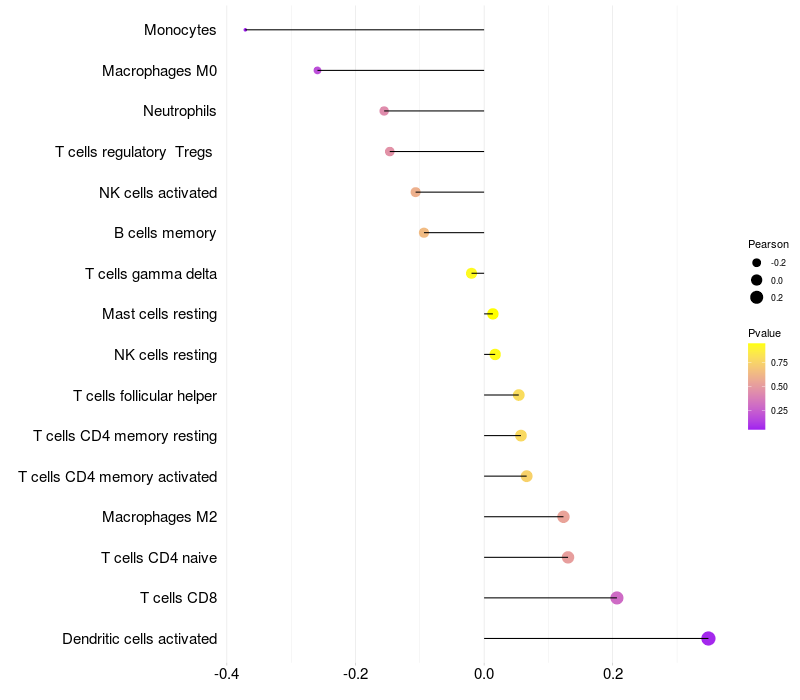 Lollipop of NBR2 expression and immune infiltrating cell level correlation result in HTLV1+ samples