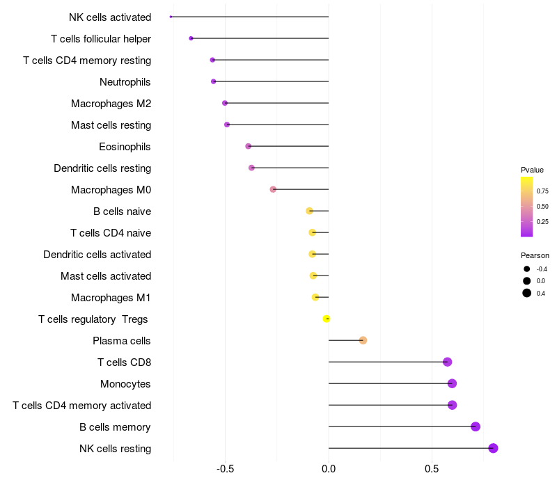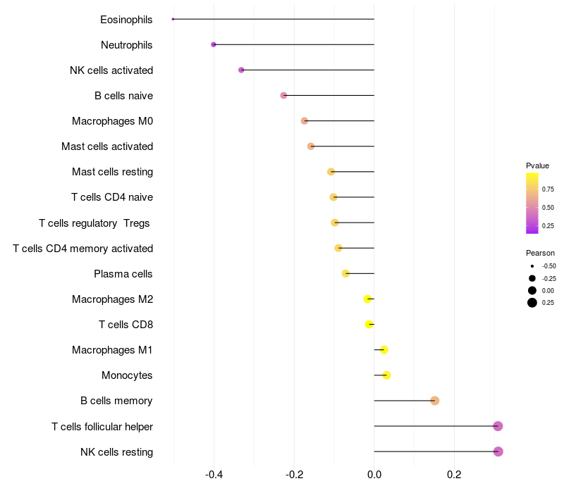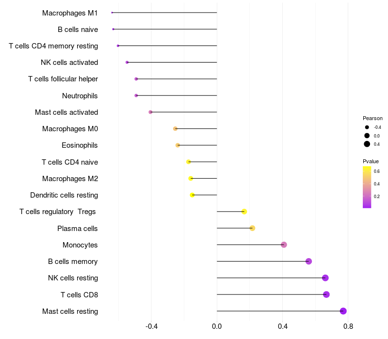 Lollipop of NCALD expression and immune infiltrating cell level correlation result in HBV+ Liver cirrhosis samples