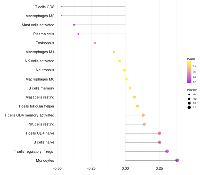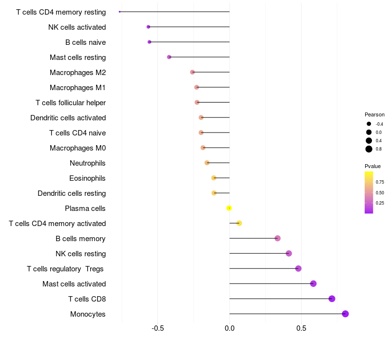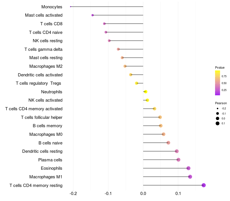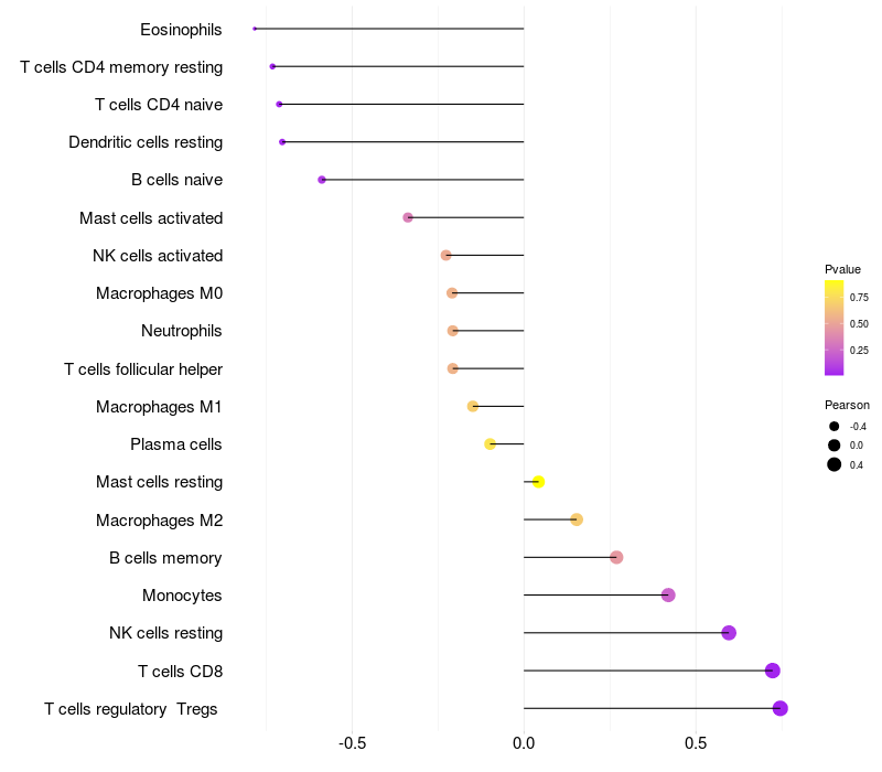 Lollipop of NCOA3 expression and immune infiltrating cell level correlation result in HBV+ Liver cirrhosis samples