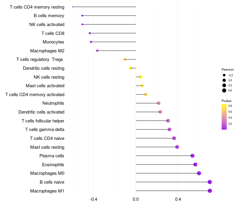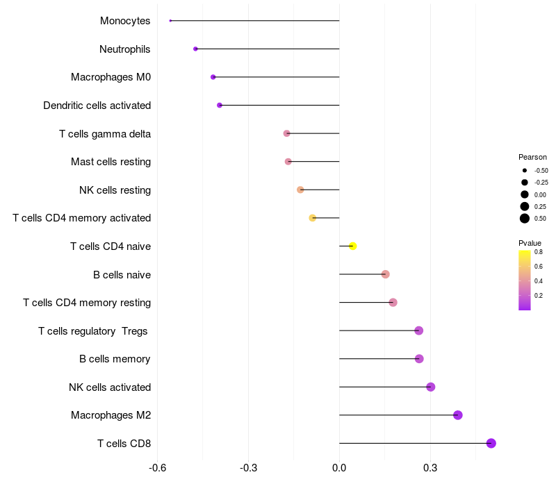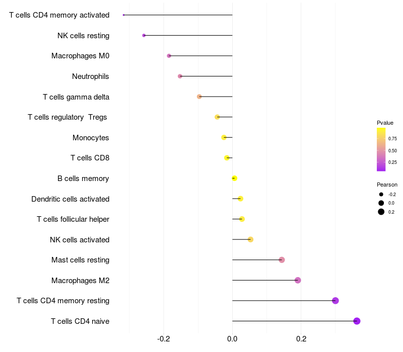 Lollipop of NDFIP2 expression and immune infiltrating cell level correlation result in HTLV1+ samples