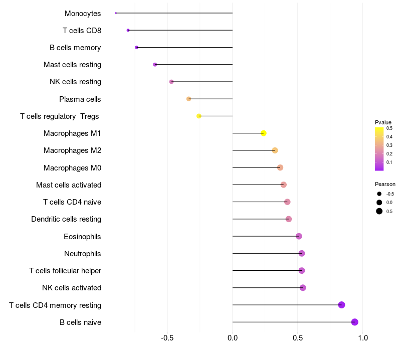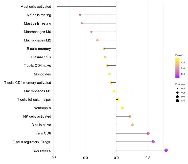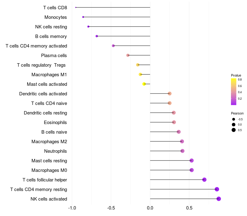 Lollipop of NDST1 expression and immune infiltrating cell level correlation result in HBV+ Liver cirrhosis samples