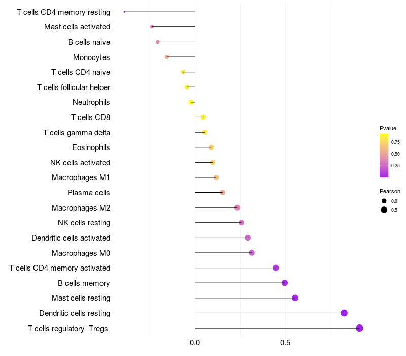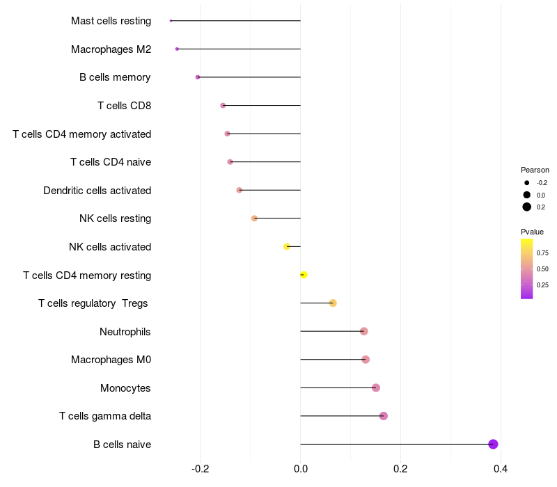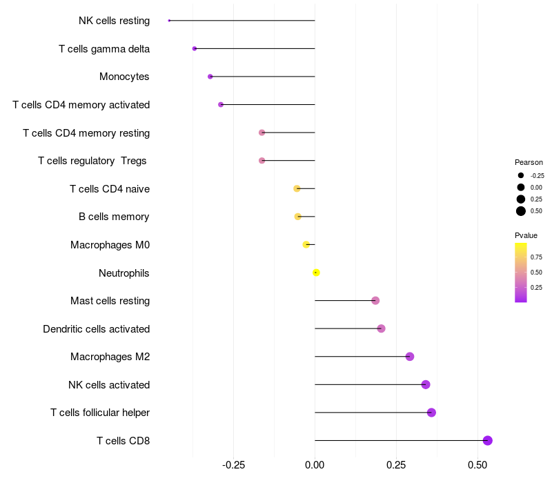 Lollipop of NEFH expression and immune infiltrating cell level correlation result in HTLV1+ samples