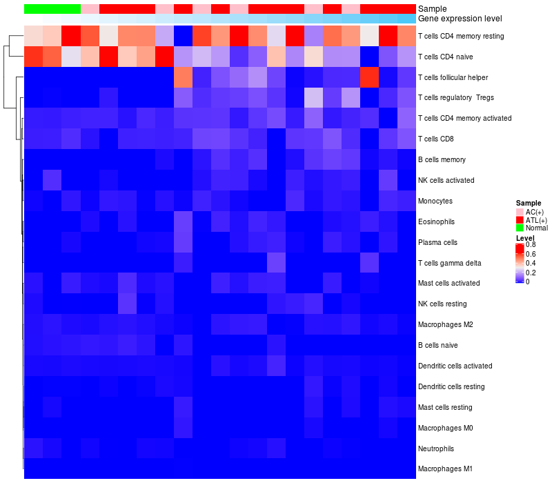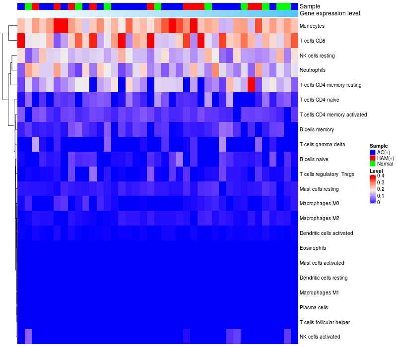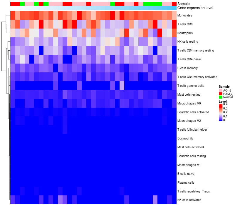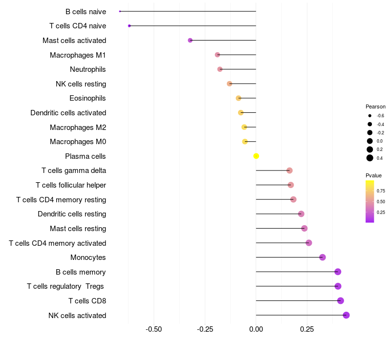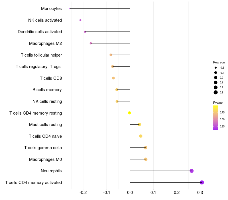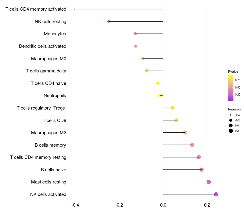 Lollipop of NEK10 expression and immune infiltrating cell level correlation result in HTLV1+ samples