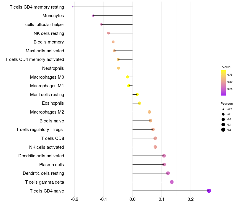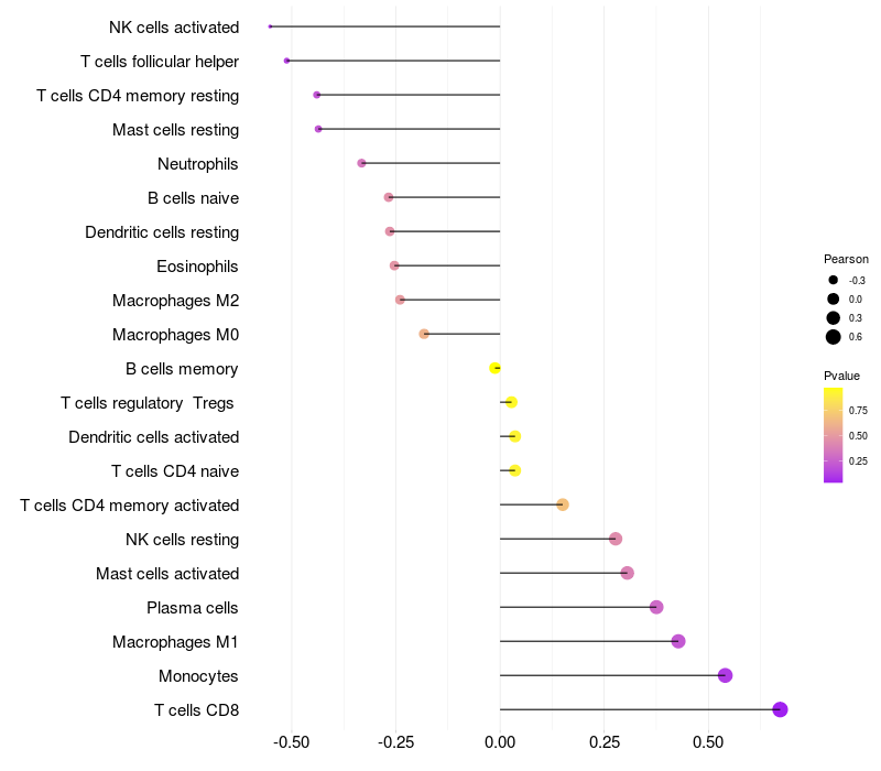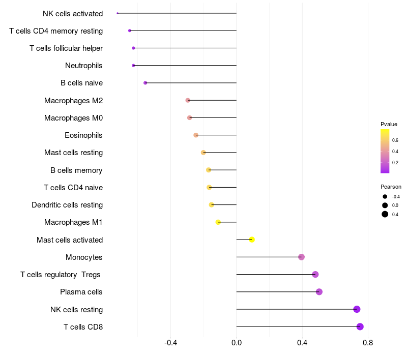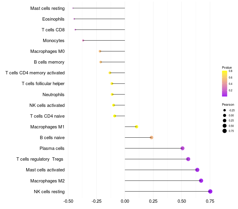 Lollipop of NEK5 expression and immune infiltrating cell level correlation result in HBV+ Liver cirrhosis samples