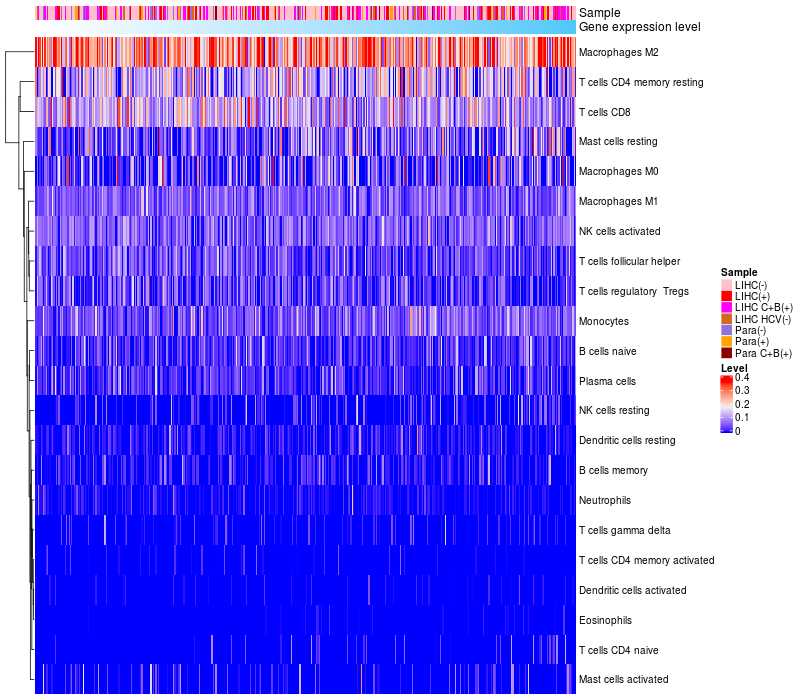 Liver hepatocellular carcinoma HCV (HBV+)(86), Liver hepatocellular carcinoma HCV (HBV-)(19), Liver hepatocellular carcinoma (HBV+)(209), Liver hepatocellular carcinoma (HBV+)(60), Paracancerous HCV (HBV+)(4), Paracancerous (HBV-)(28), Paracancerous (HBV+)(18) |