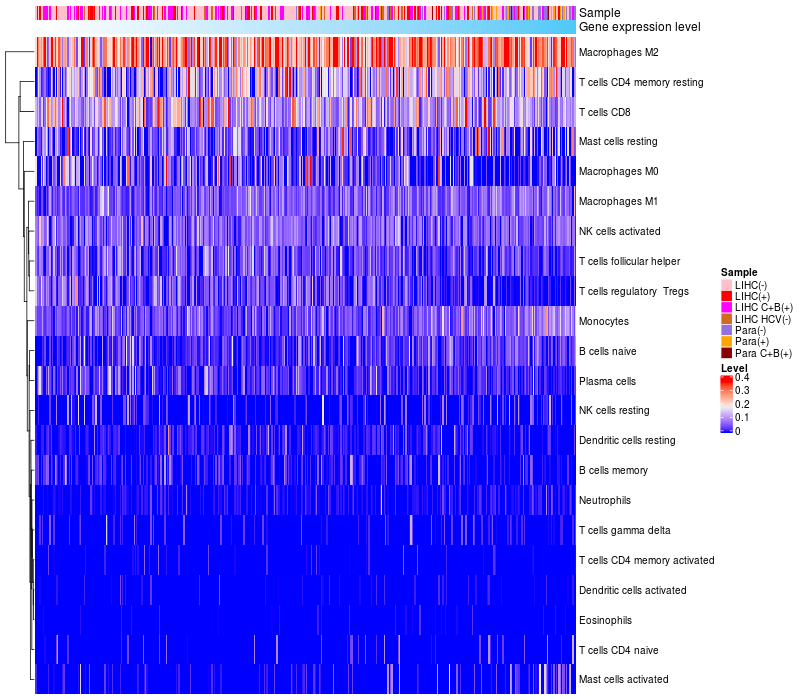 Liver hepatocellular carcinoma HCV (HBV+)(86), Liver hepatocellular carcinoma HCV (HBV-)(19), Liver hepatocellular carcinoma (HBV+)(209), Liver hepatocellular carcinoma (HBV+)(60), Paracancerous HCV (HBV+)(4), Paracancerous (HBV-)(28), Paracancerous (HBV+)(18) |