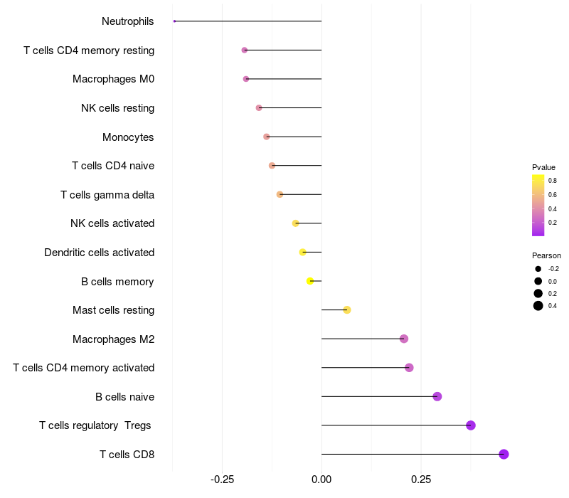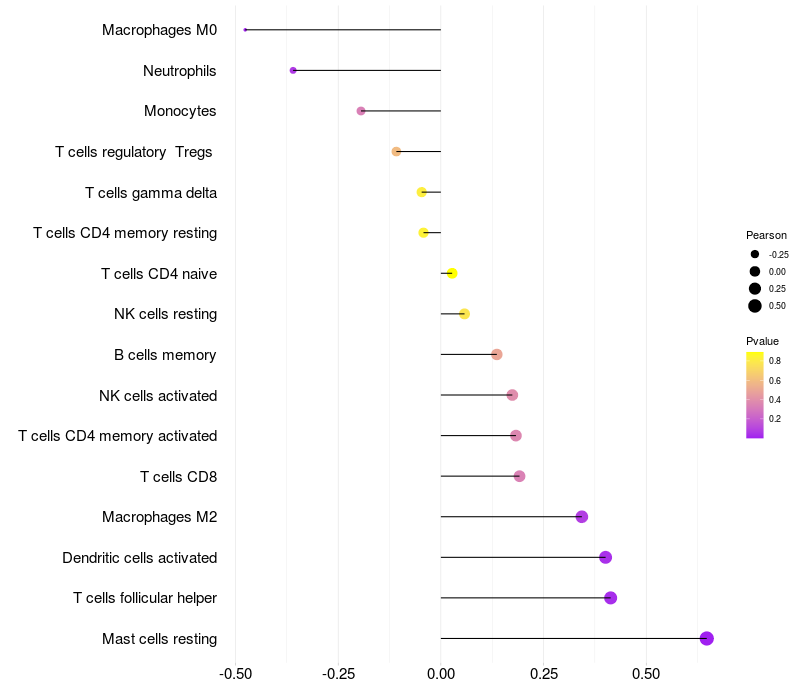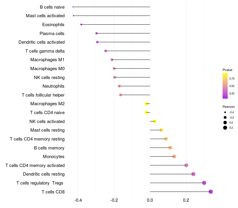 Lollipop of NHLRC2 expression and immune infiltrating cell level correlation result in HTLV1+ samples