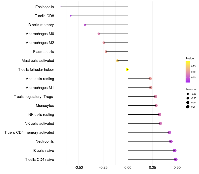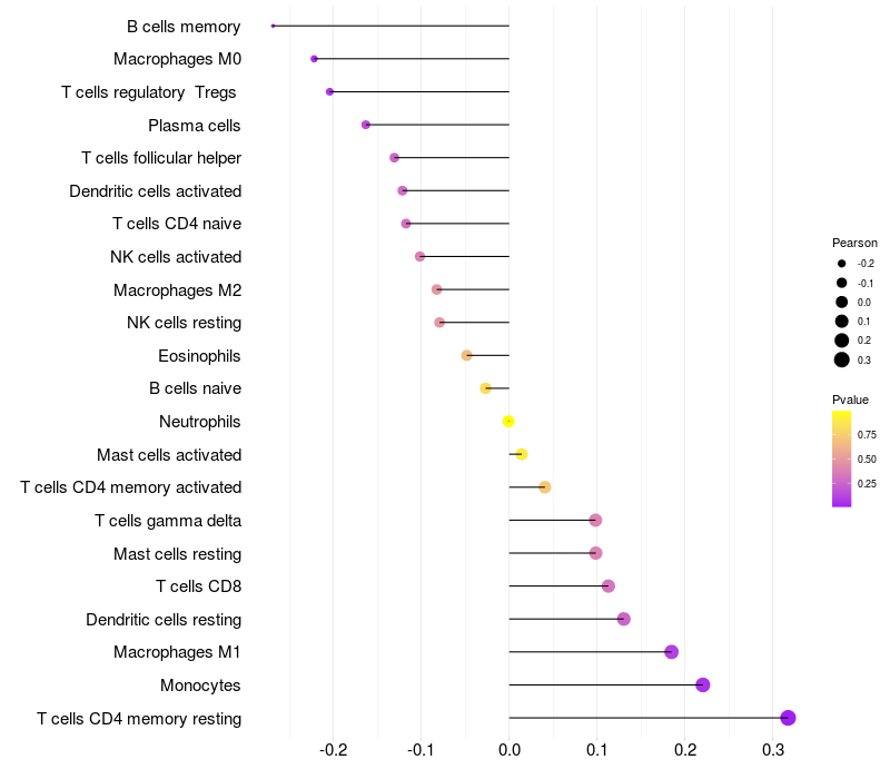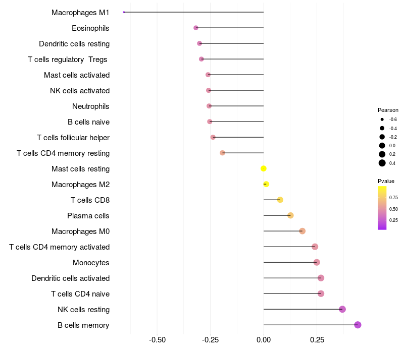 Lollipop of NHSL1 expression and immune infiltrating cell level correlation result in HBV+ Liver cirrhosis samples