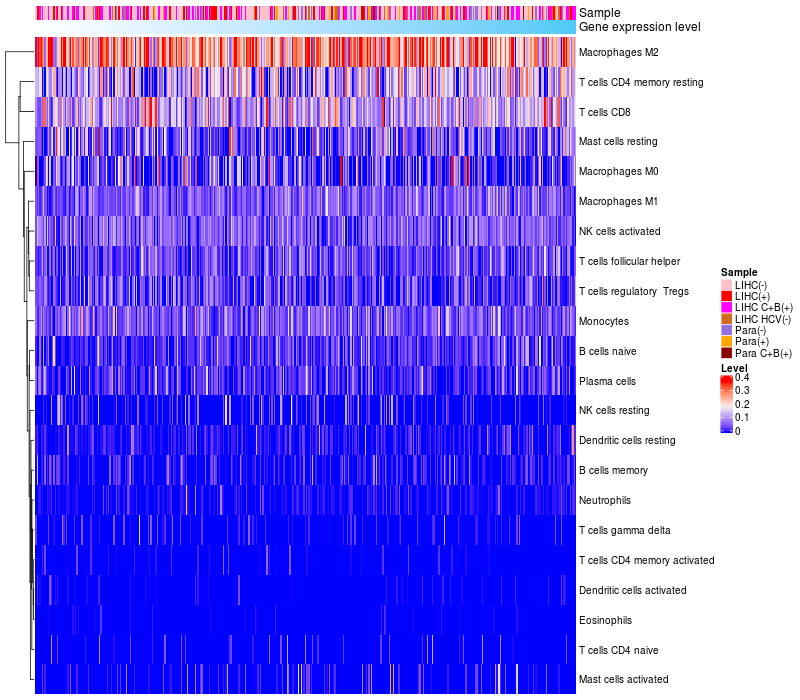 Liver hepatocellular carcinoma HCV (HBV+)(86), Liver hepatocellular carcinoma HCV (HBV-)(19), Liver hepatocellular carcinoma (HBV+)(209), Liver hepatocellular carcinoma (HBV+)(60), Paracancerous HCV (HBV+)(4), Paracancerous (HBV-)(28), Paracancerous (HBV+)(18) |