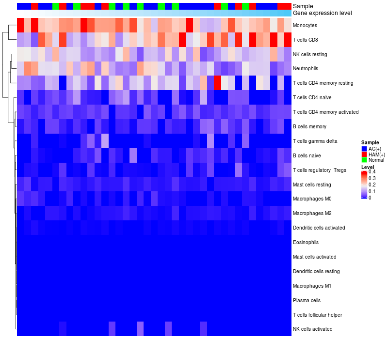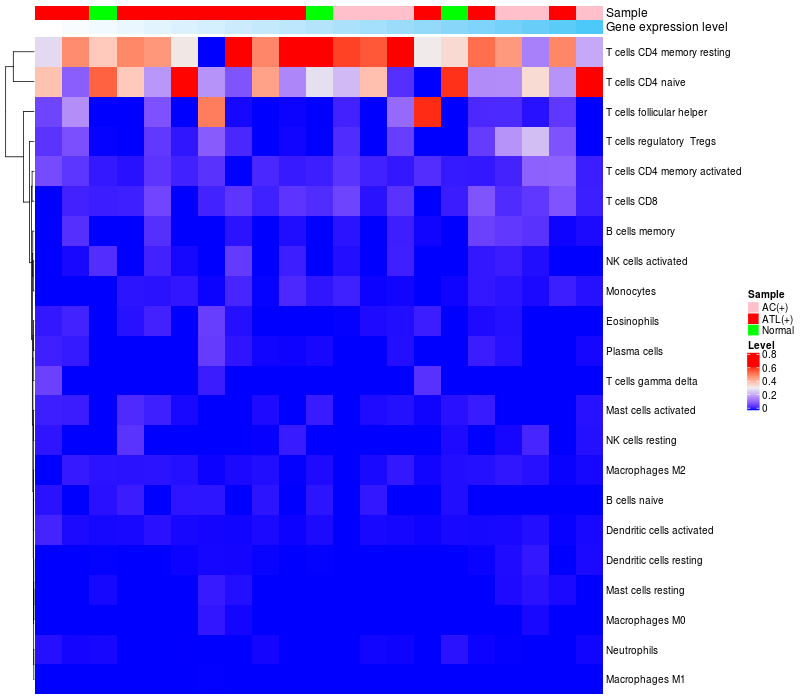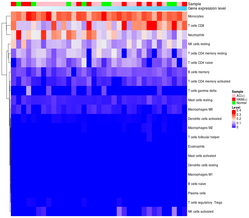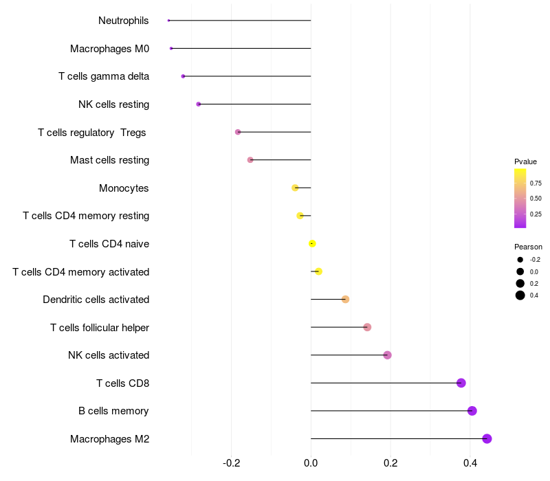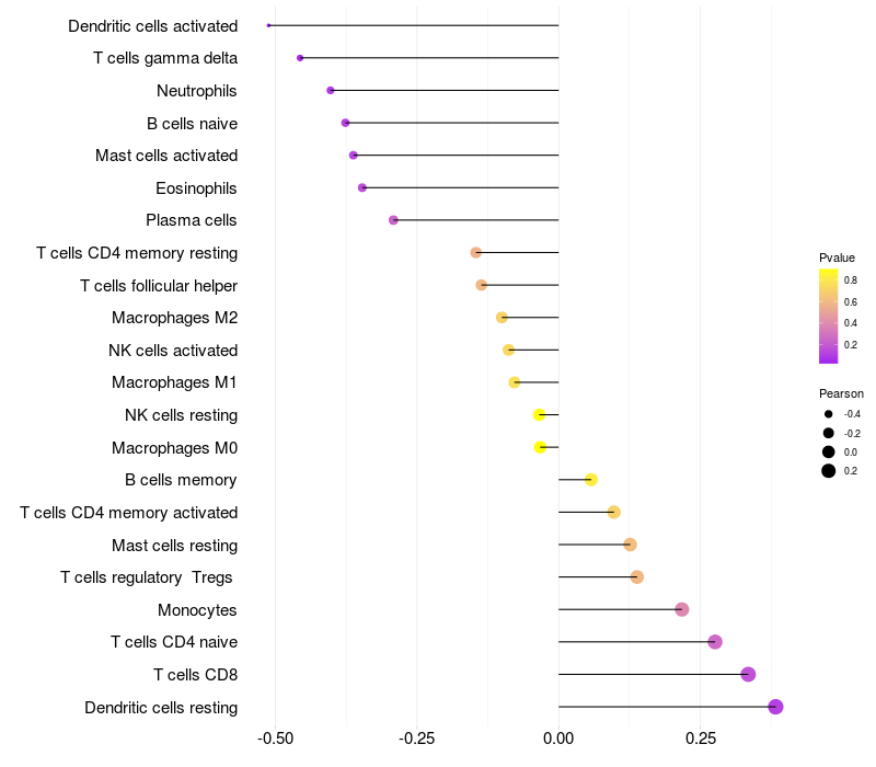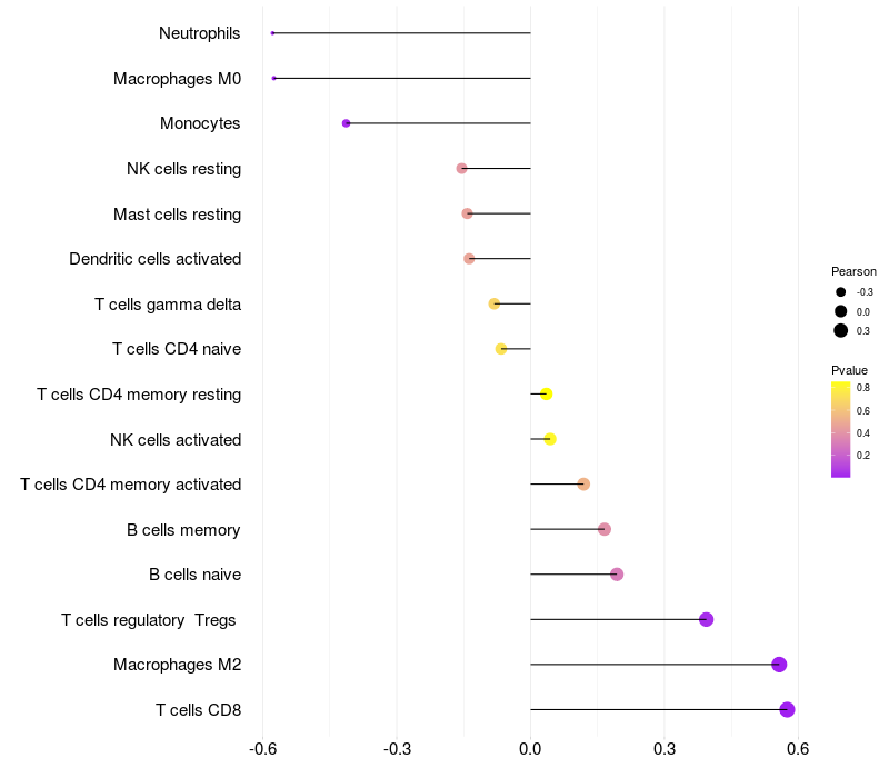 Lollipop of NICN1 expression and immune infiltrating cell level correlation result in HTLV1+ samples