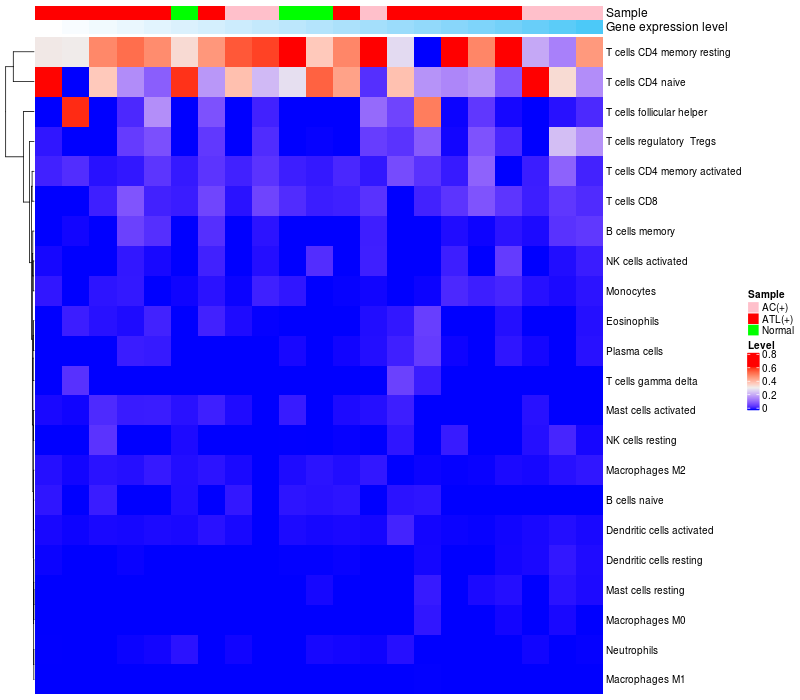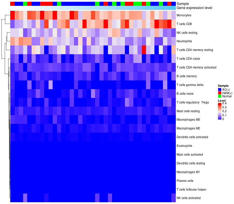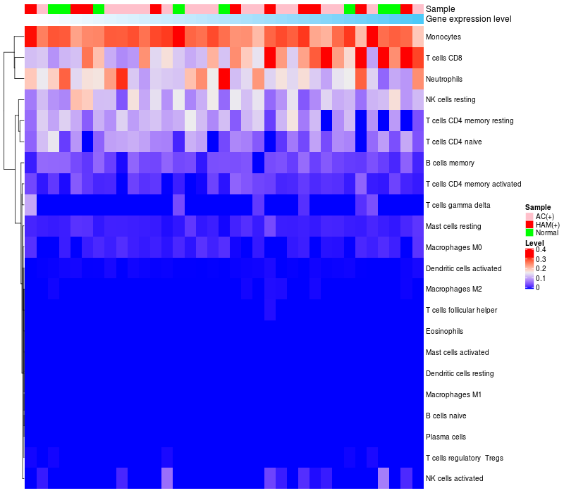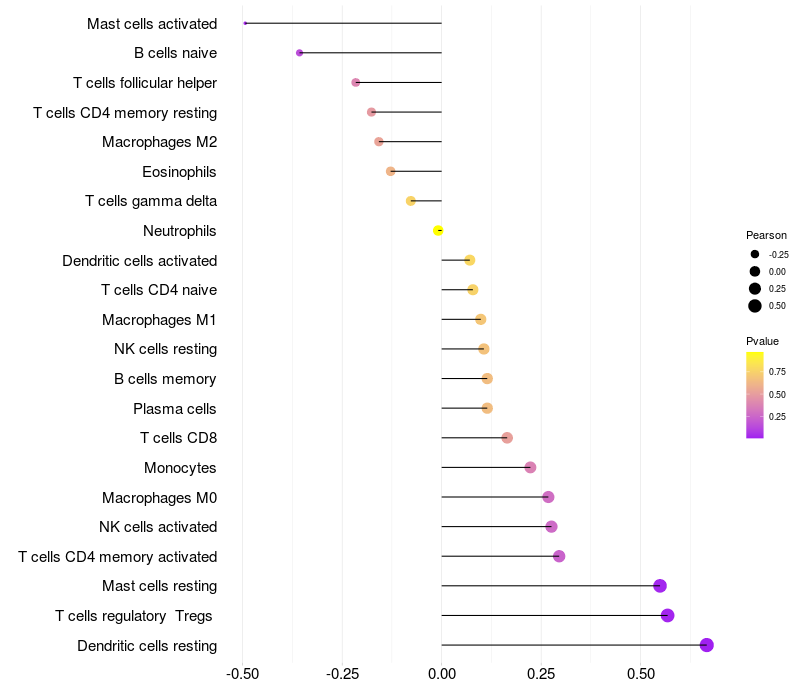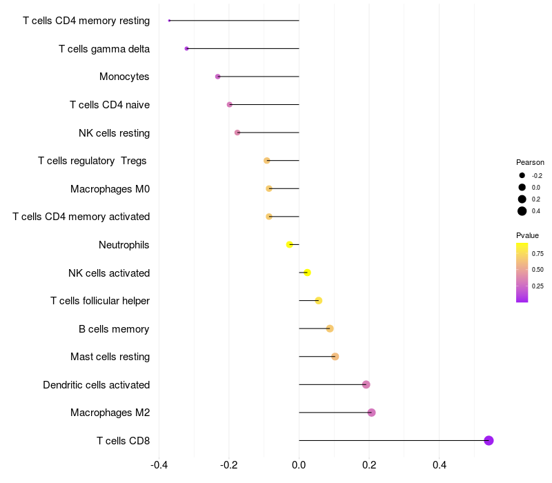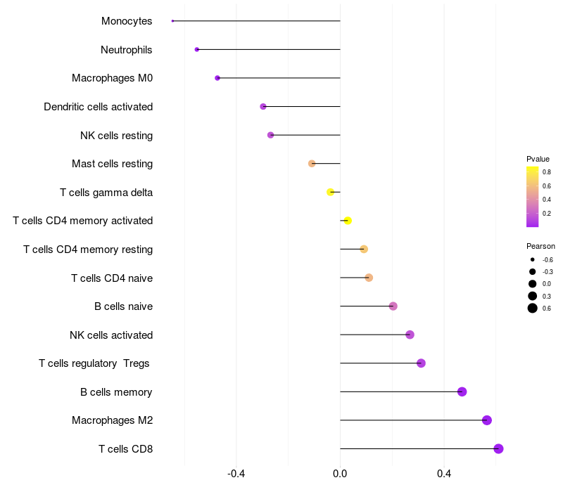 Lollipop of NIPSNAP1 expression and immune infiltrating cell level correlation result in HTLV1+ samples