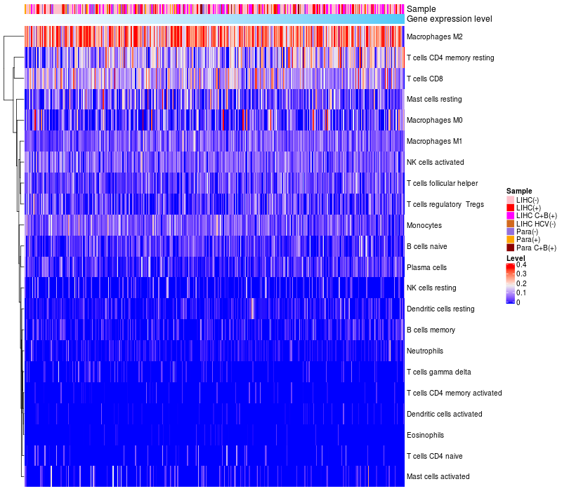 Liver hepatocellular carcinoma HCV (HBV+)(86), Liver hepatocellular carcinoma HCV (HBV-)(19), Liver hepatocellular carcinoma (HBV+)(209), Liver hepatocellular carcinoma (HBV+)(60), Paracancerous HCV (HBV+)(4), Paracancerous (HBV-)(28), Paracancerous (HBV+)(18) |