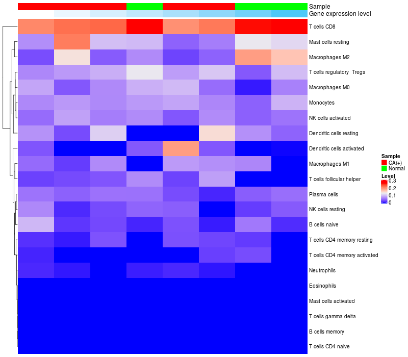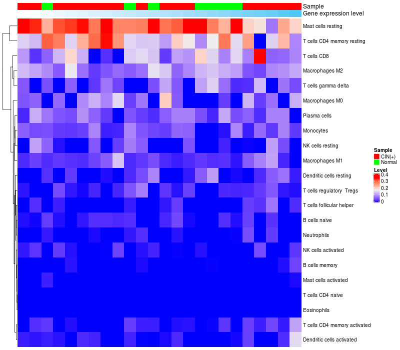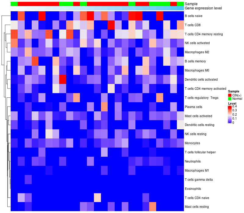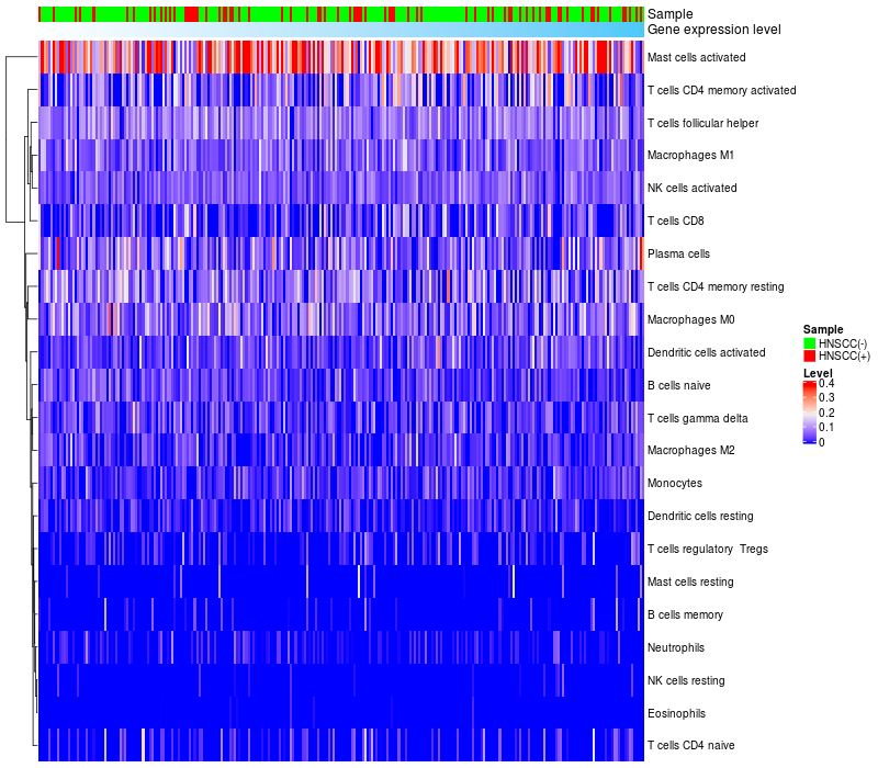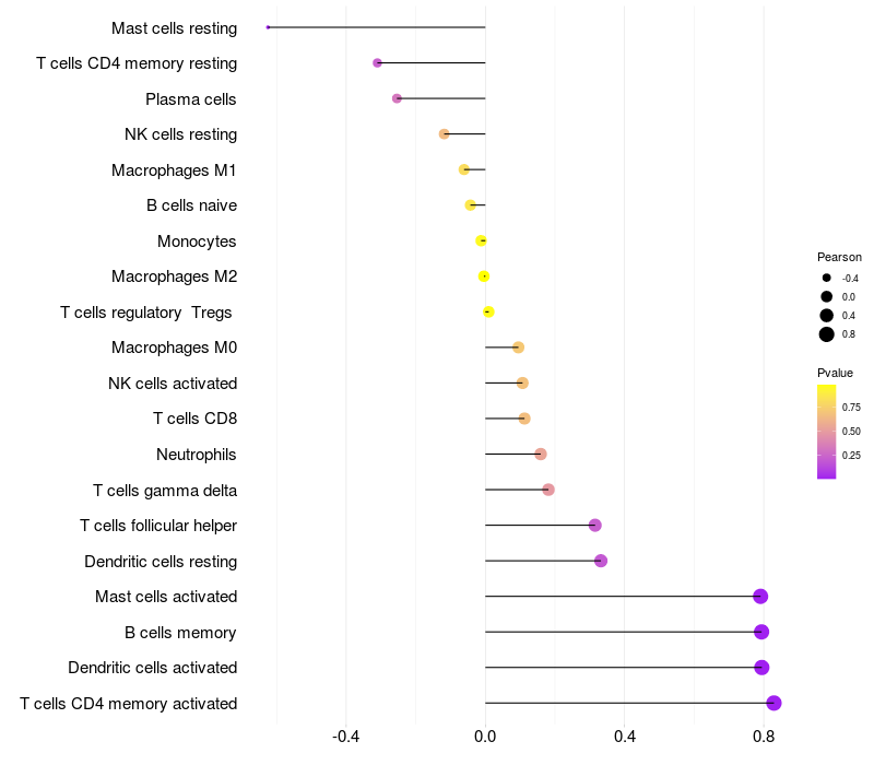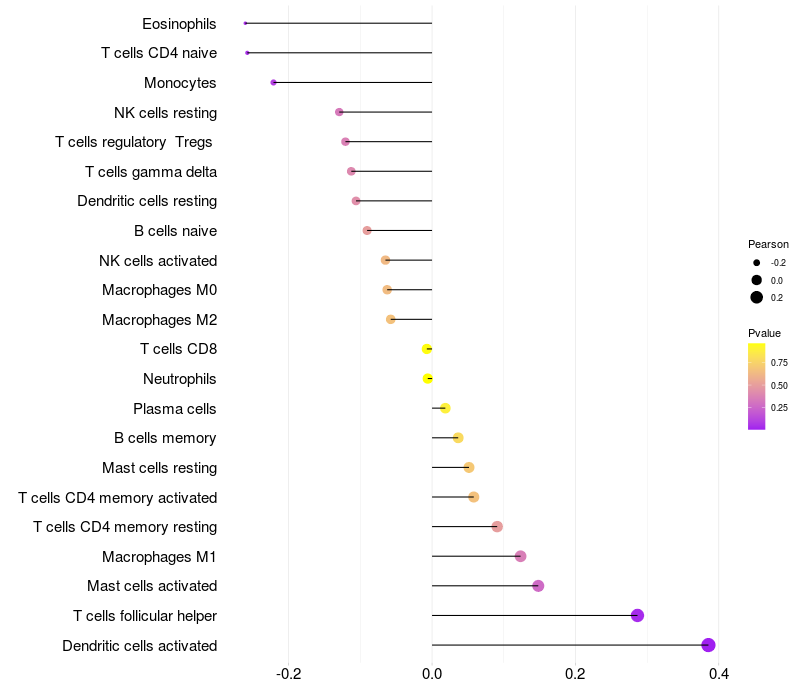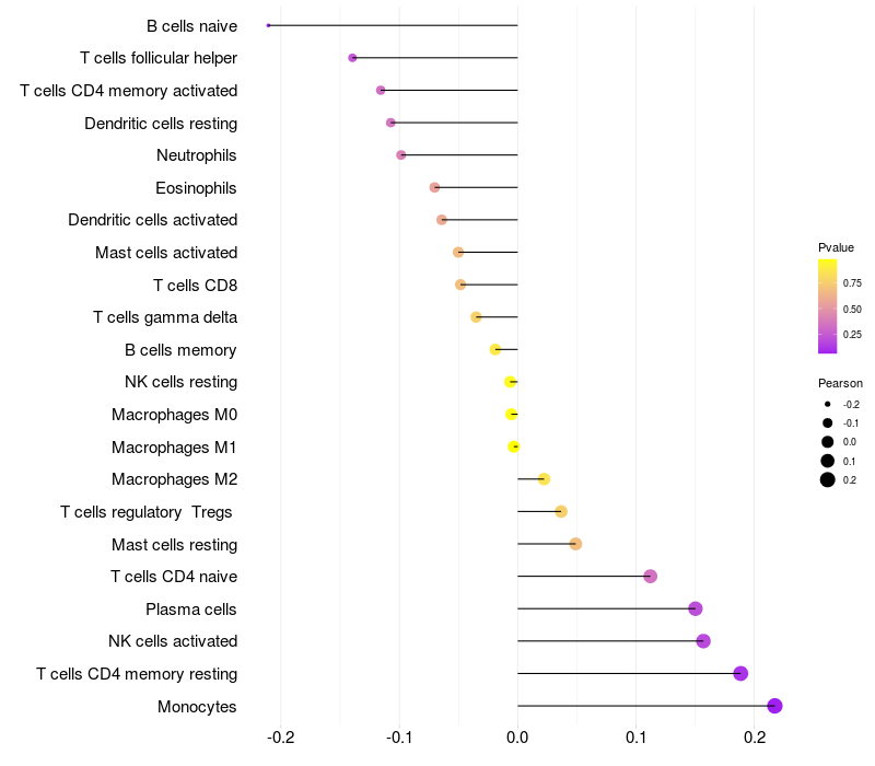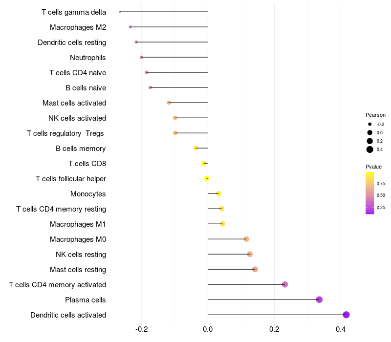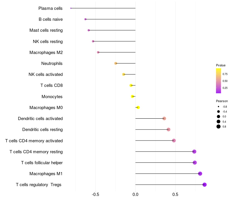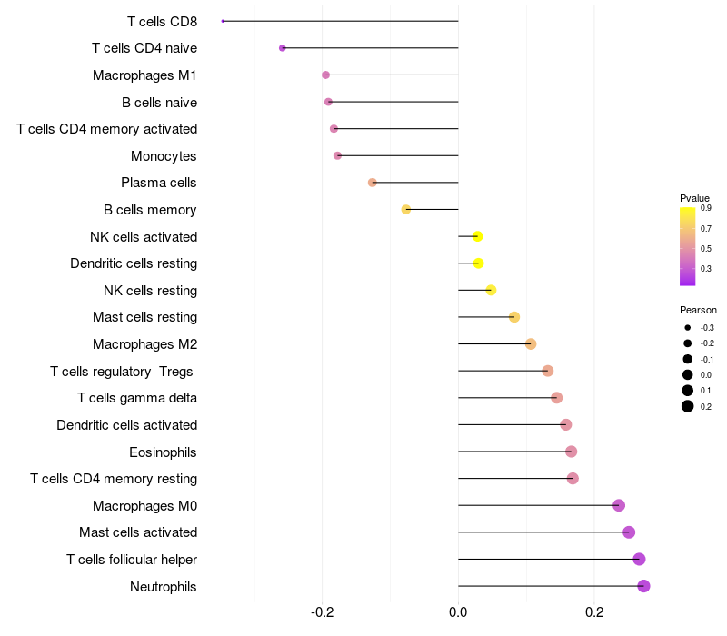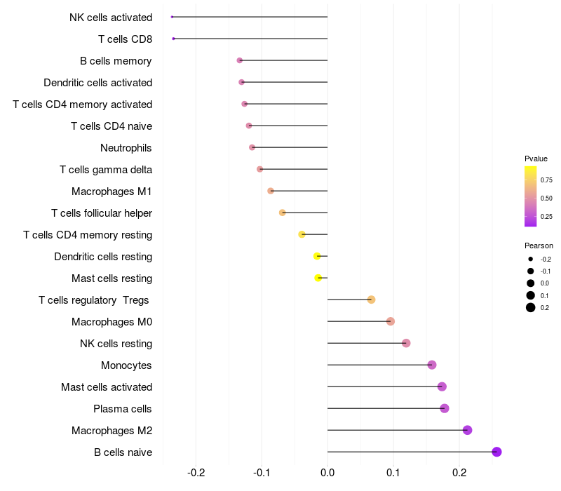 Lollipop of NKX3-1 expression and immune infiltrating cell level correlation result in HPV+ samples