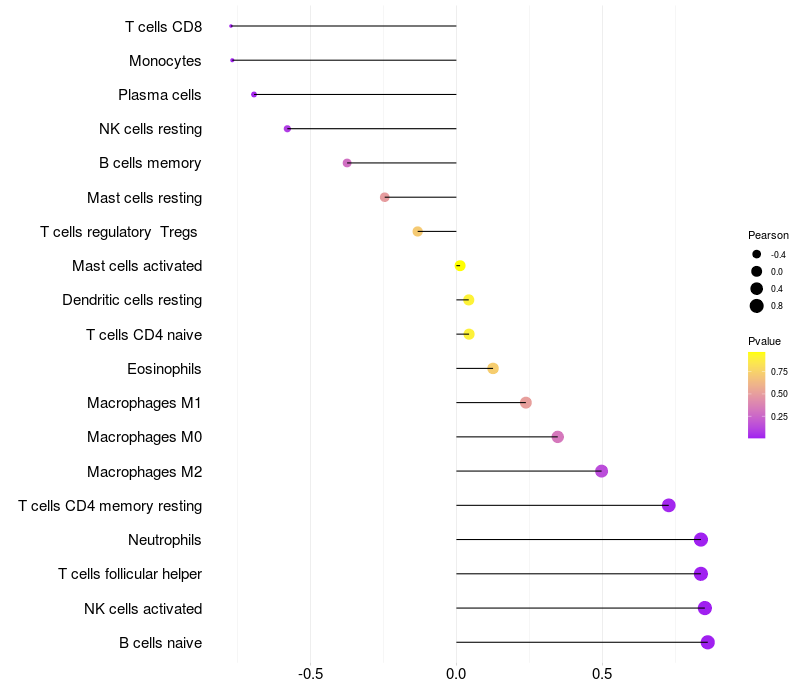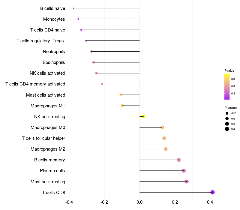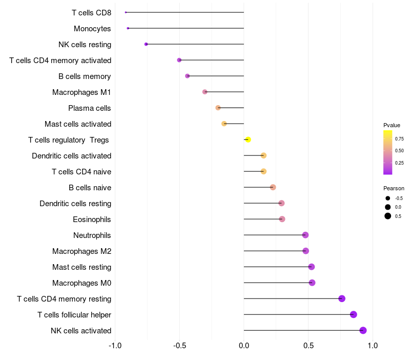 Lollipop of NMT2 expression and immune infiltrating cell level correlation result in HBV+ Liver cirrhosis samples