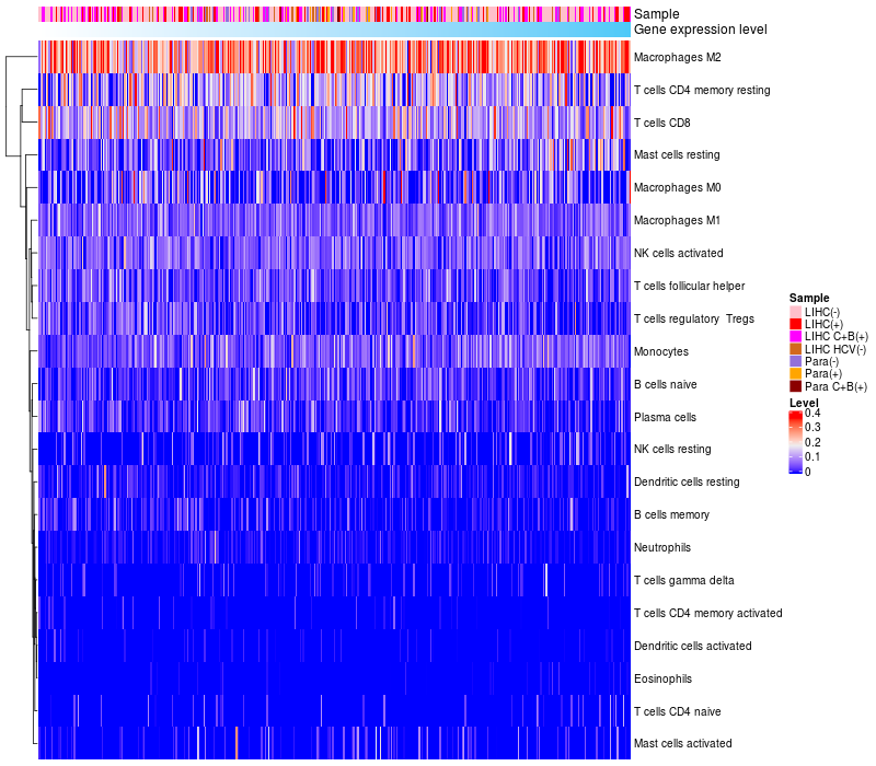 Liver hepatocellular carcinoma HCV (HBV+)(86), Liver hepatocellular carcinoma HCV (HBV-)(19), Liver hepatocellular carcinoma (HBV+)(209), Liver hepatocellular carcinoma (HBV+)(60), Paracancerous HCV (HBV+)(4), Paracancerous (HBV-)(28), Paracancerous (HBV+)(18) |