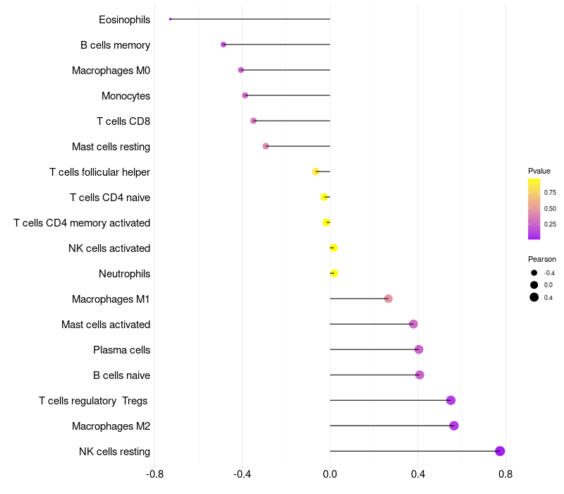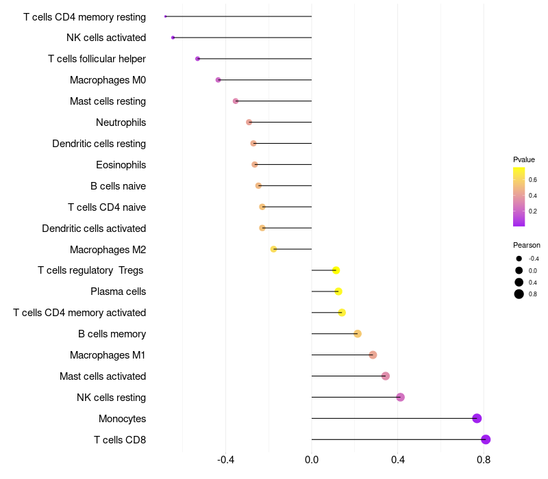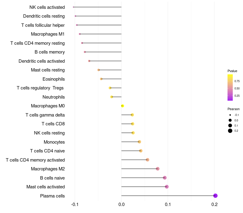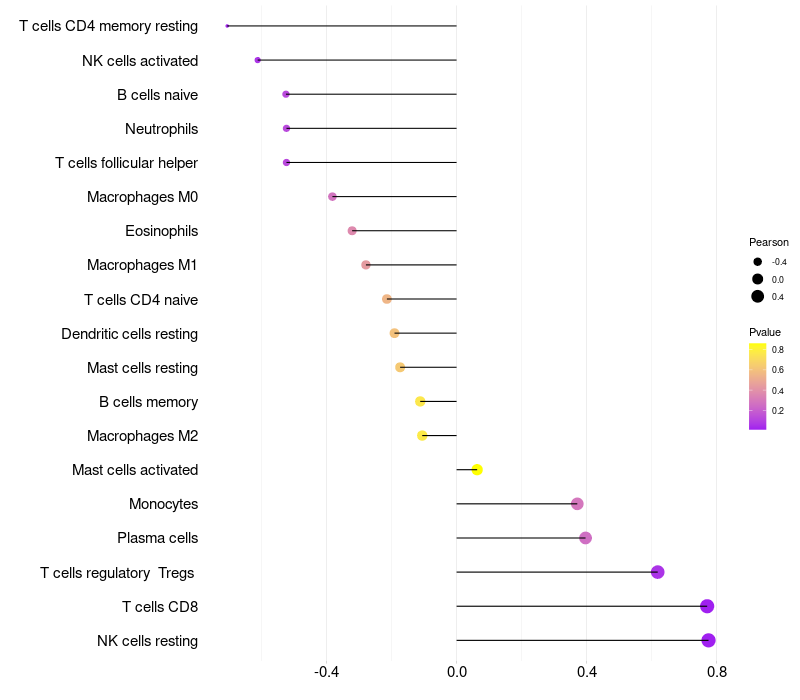 Lollipop of NMUR2 expression and immune infiltrating cell level correlation result in HBV+ Liver cirrhosis samples