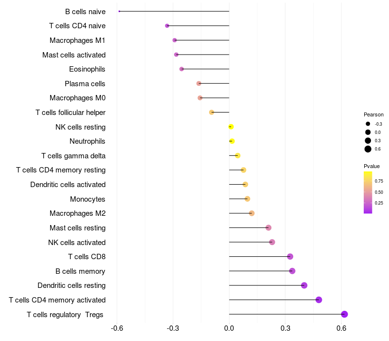 Lollipop of NOD1 expression and immune infiltrating cell level correlation result in HTLV1+ samples