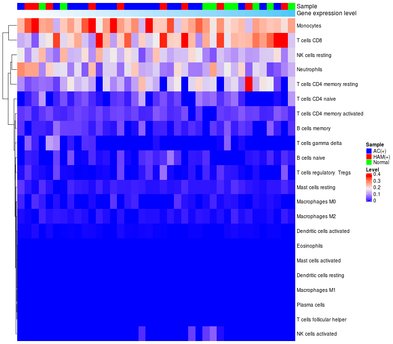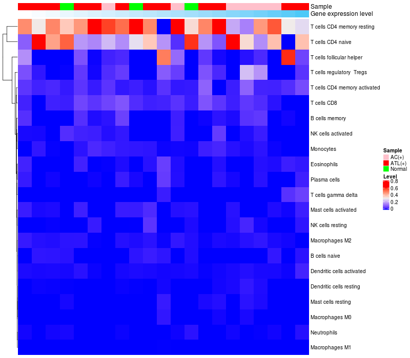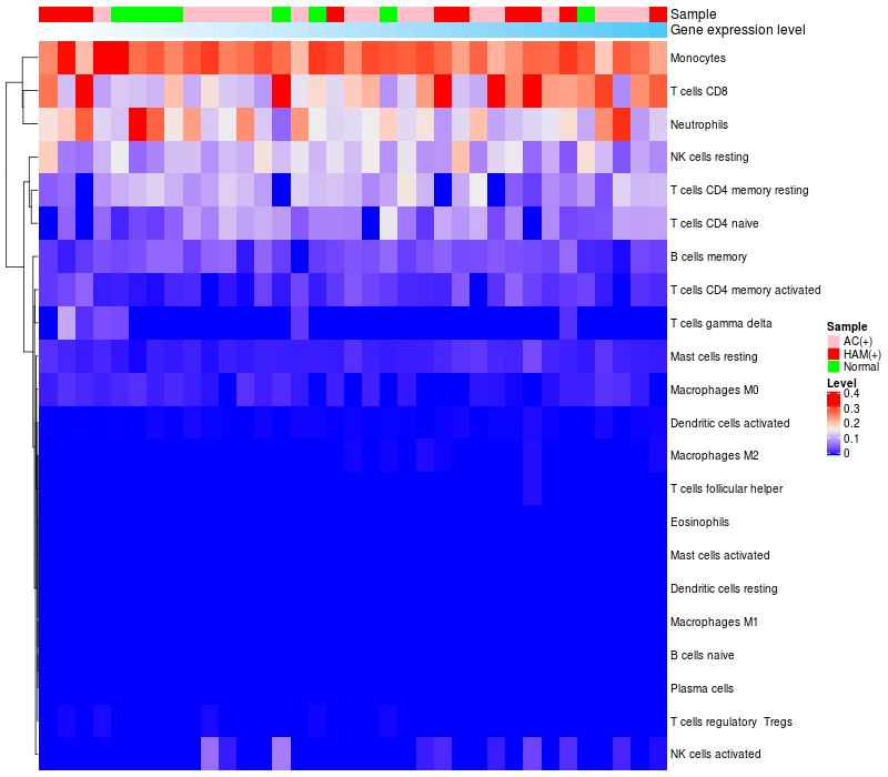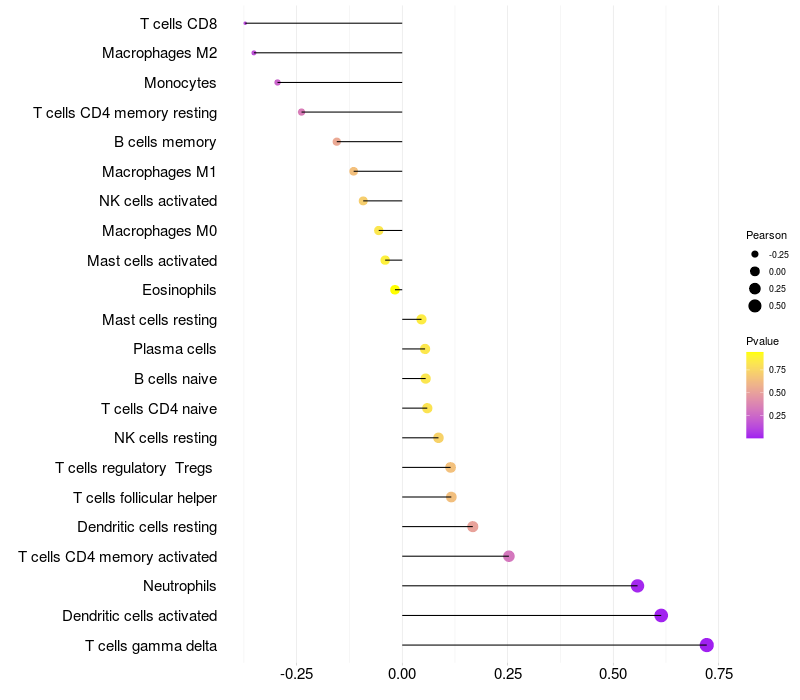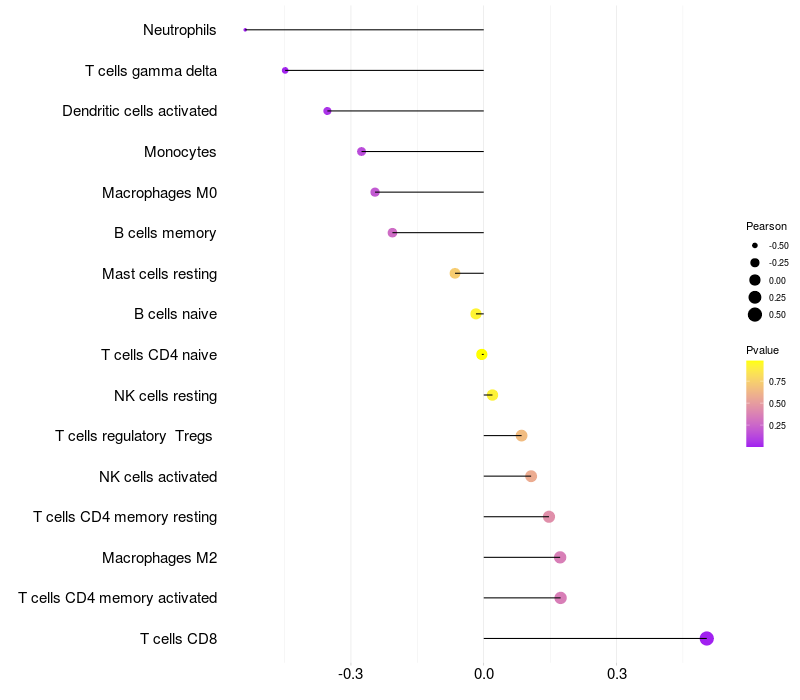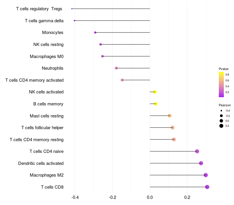 Lollipop of NOL8 expression and immune infiltrating cell level correlation result in HTLV1+ samples