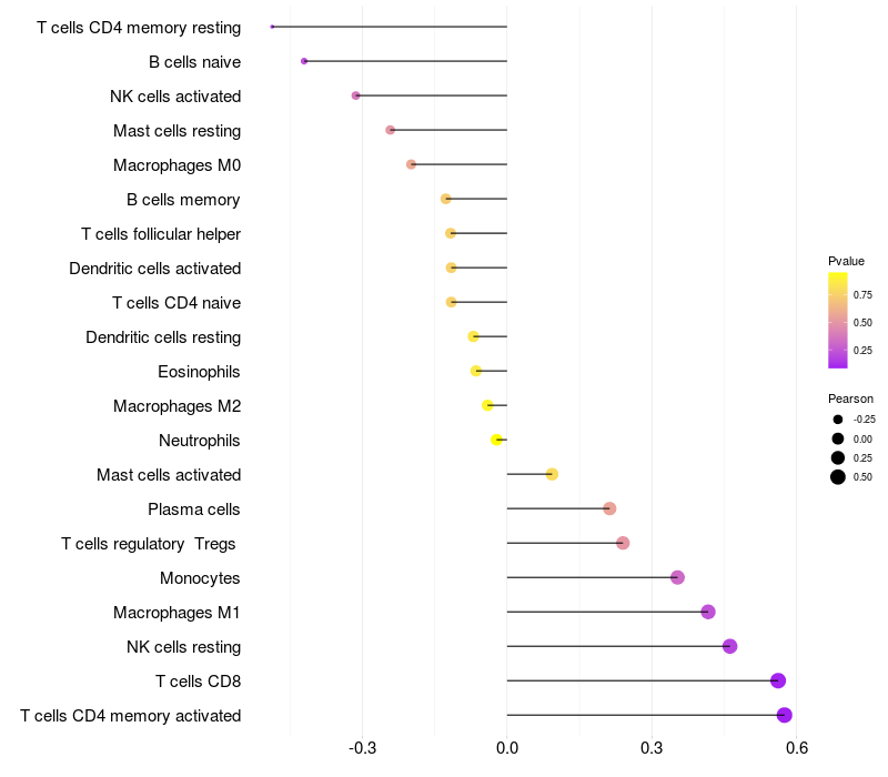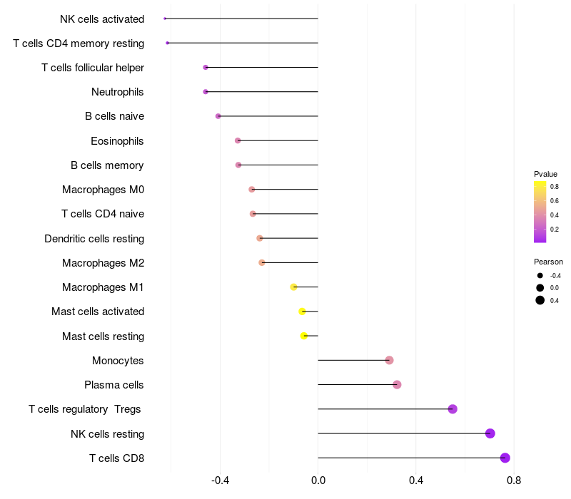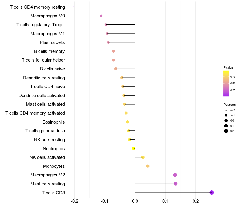 Lollipop of NOS1 expression and immune infiltrating cell level correlation result in HBV+ samples