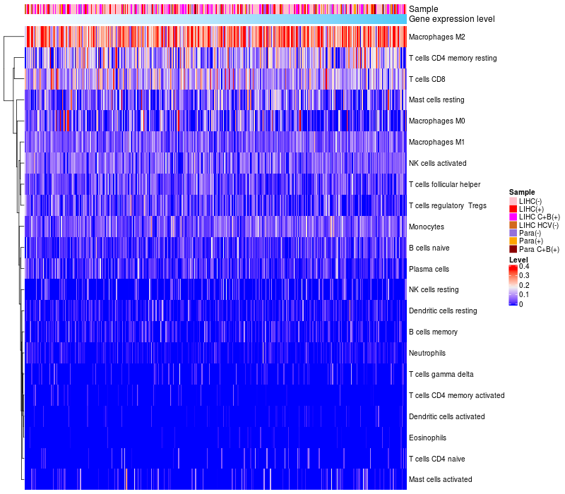 Liver hepatocellular carcinoma HCV (HBV+)(86), Liver hepatocellular carcinoma HCV (HBV-)(19), Liver hepatocellular carcinoma (HBV+)(209), Liver hepatocellular carcinoma (HBV+)(60), Paracancerous HCV (HBV+)(4), Paracancerous (HBV-)(28), Paracancerous (HBV+)(18) |