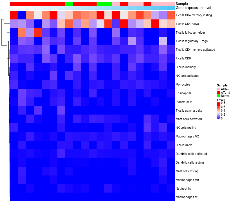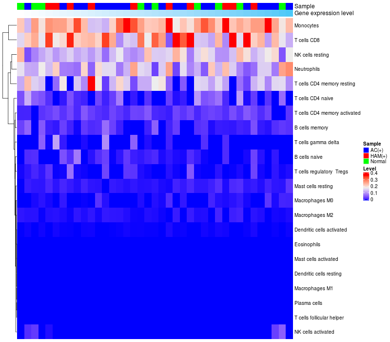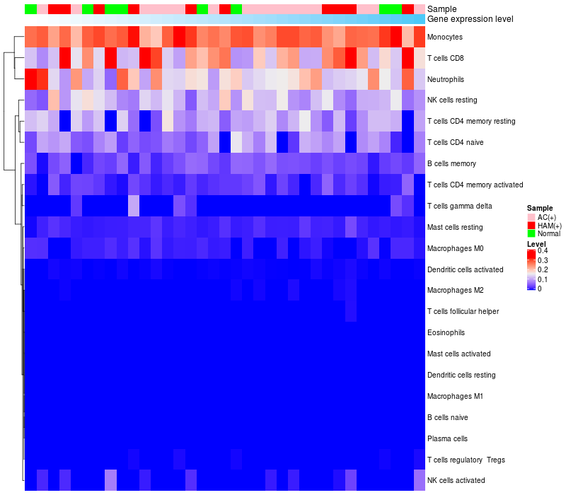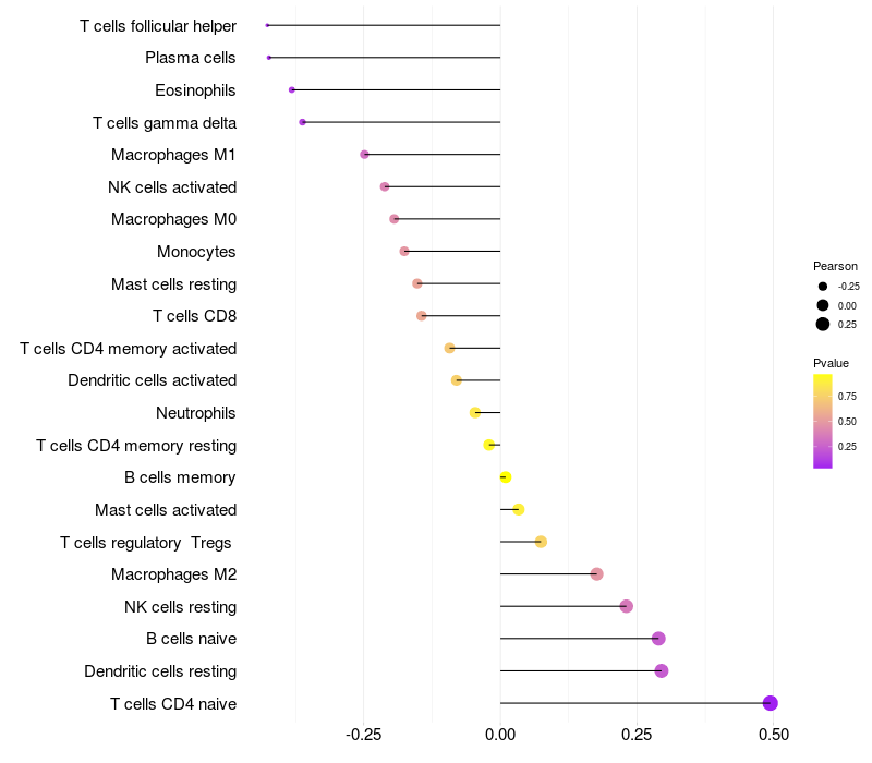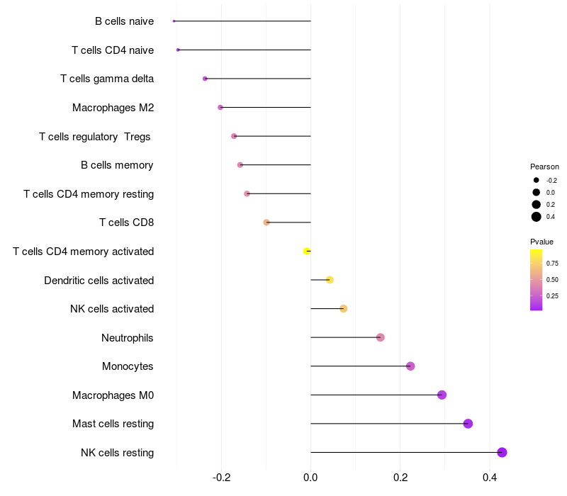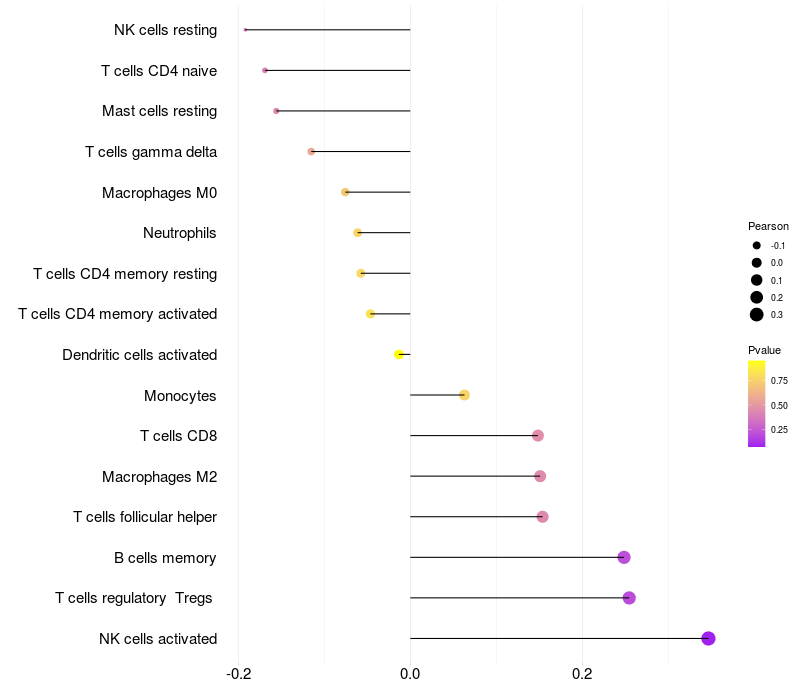 Lollipop of NPHP1 expression and immune infiltrating cell level correlation result in HTLV1+ samples