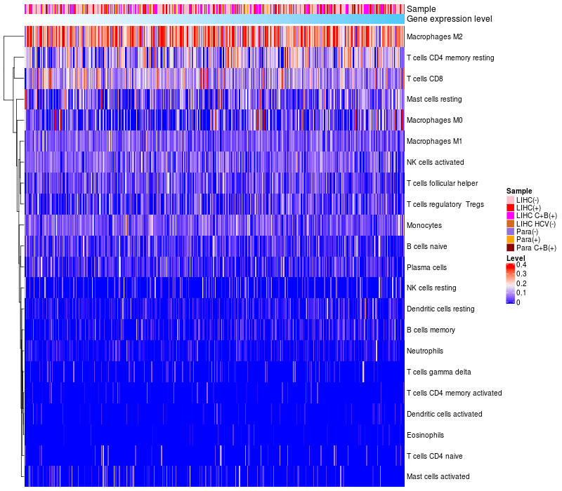 Liver hepatocellular carcinoma HCV (HBV+)(86), Liver hepatocellular carcinoma HCV (HBV-)(19), Liver hepatocellular carcinoma (HBV+)(209), Liver hepatocellular carcinoma (HBV+)(60), Paracancerous HCV (HBV+)(4), Paracancerous (HBV-)(28), Paracancerous (HBV+)(18) |