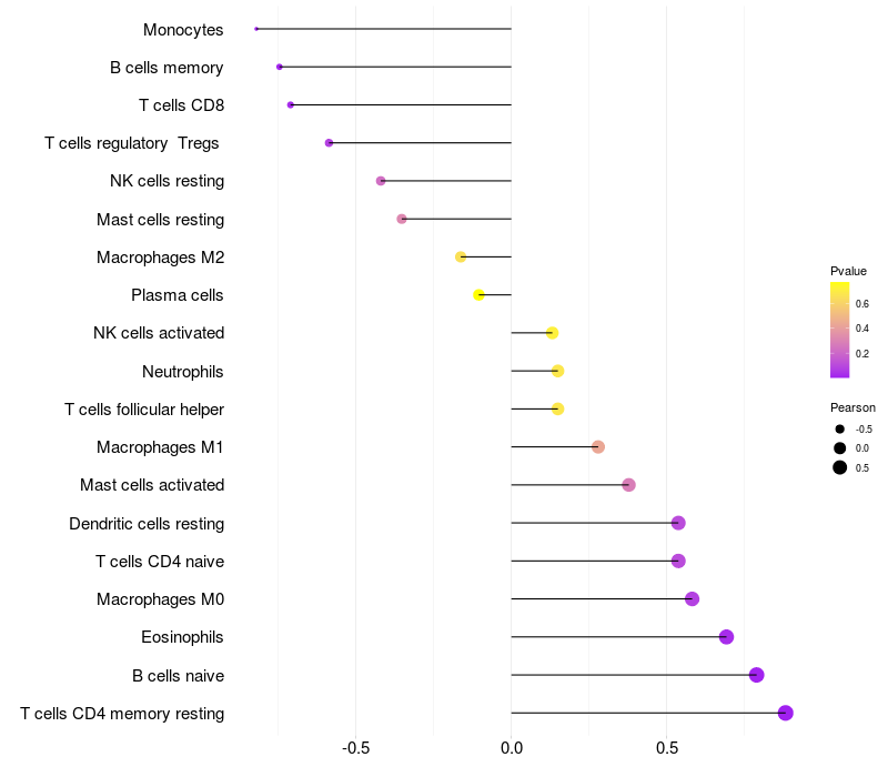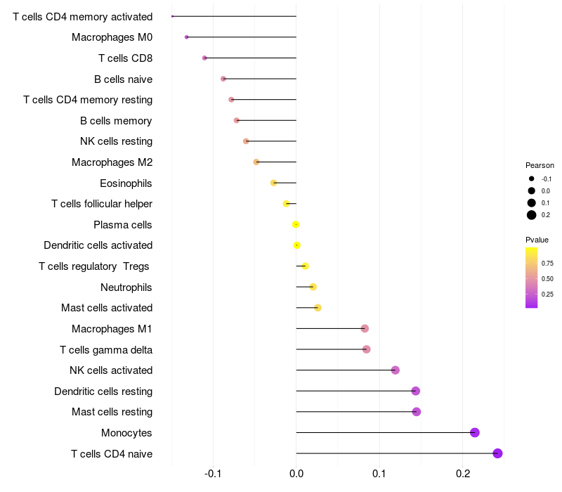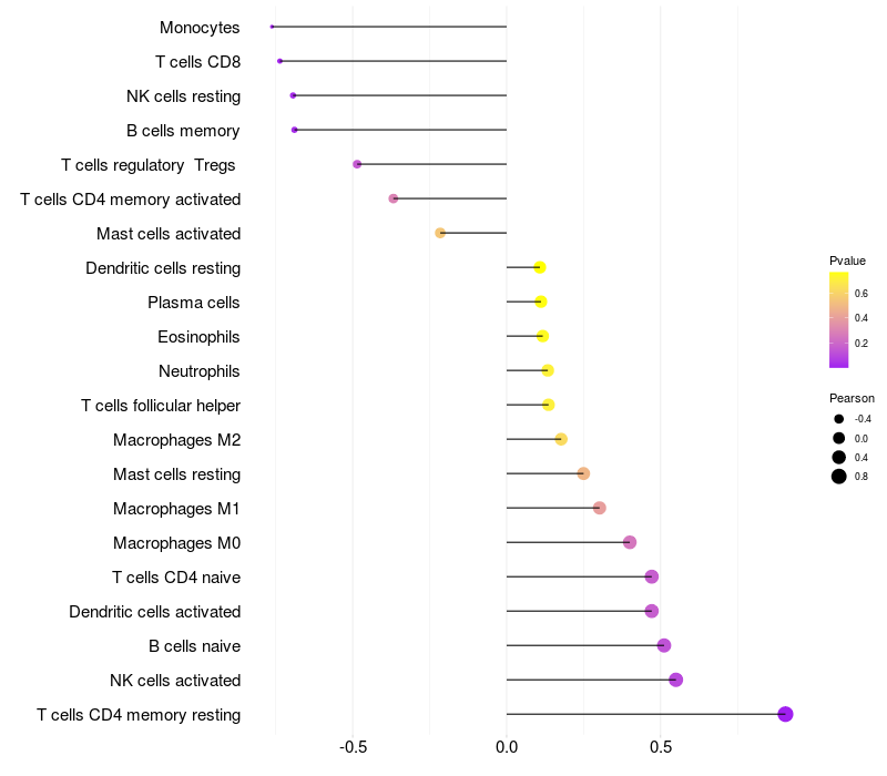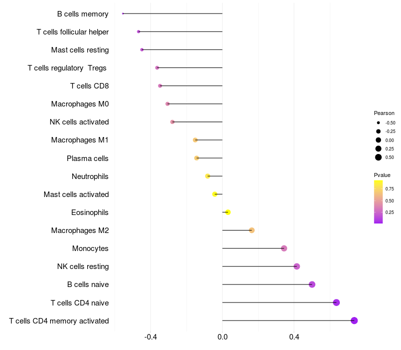 Lollipop of NPR2 expression and immune infiltrating cell level correlation result in HBV+ Liver cirrhosis samples