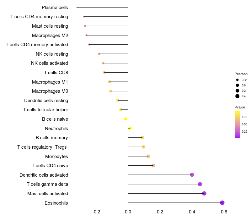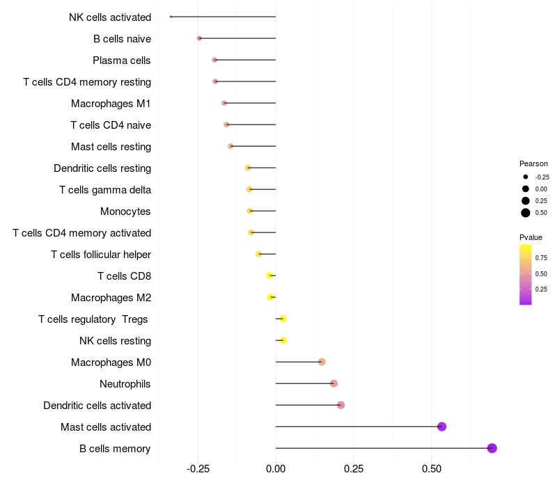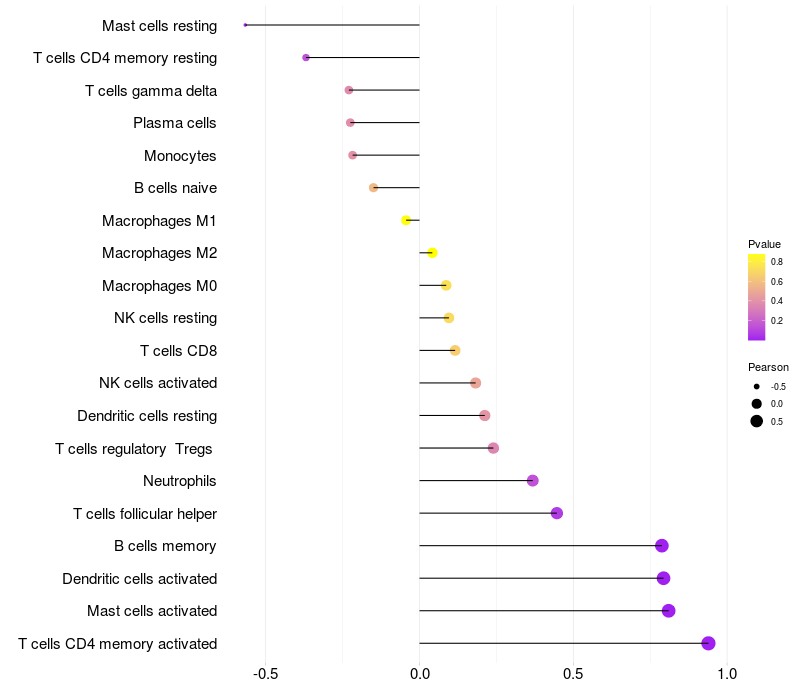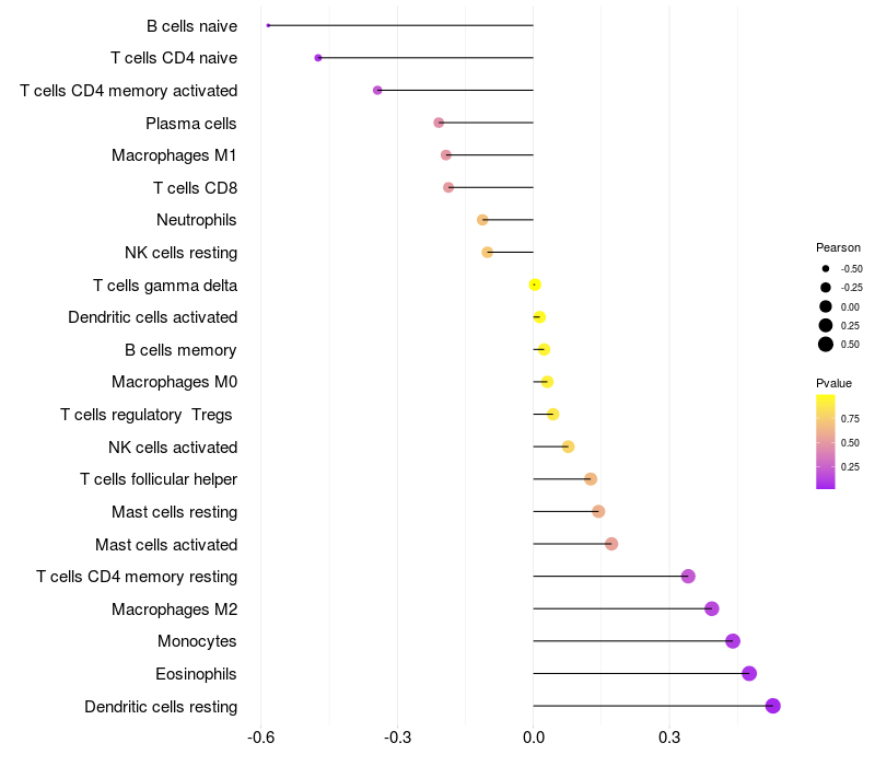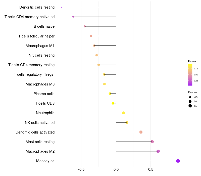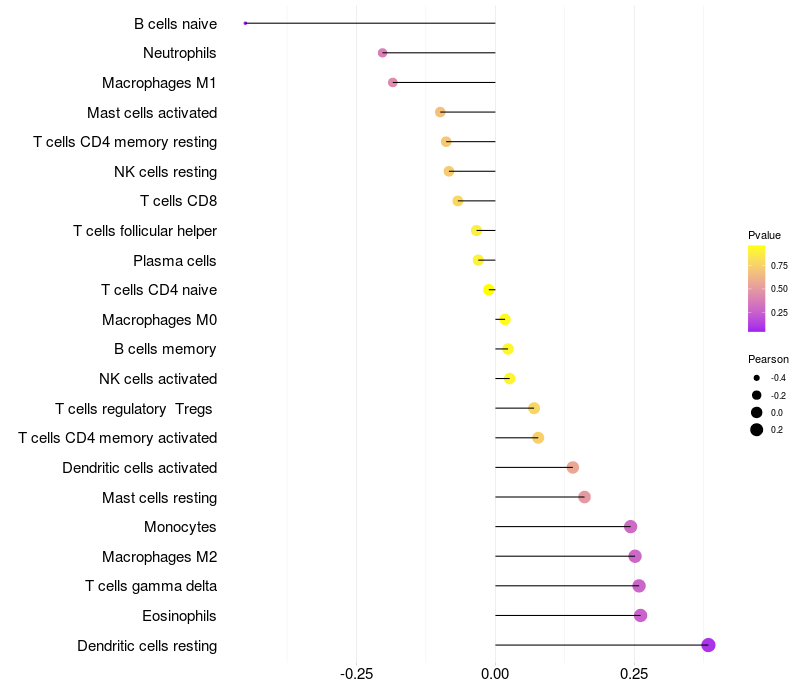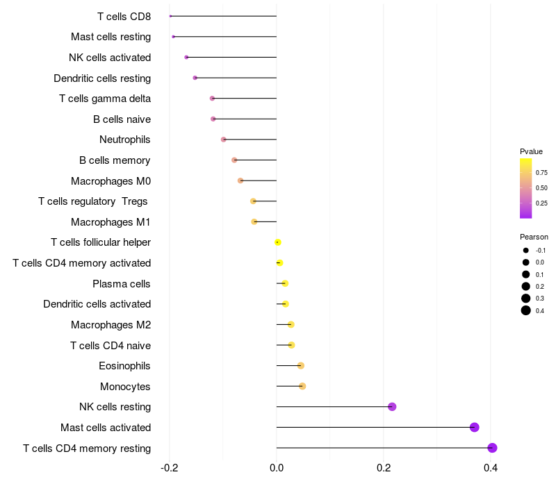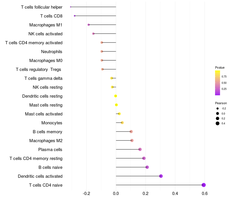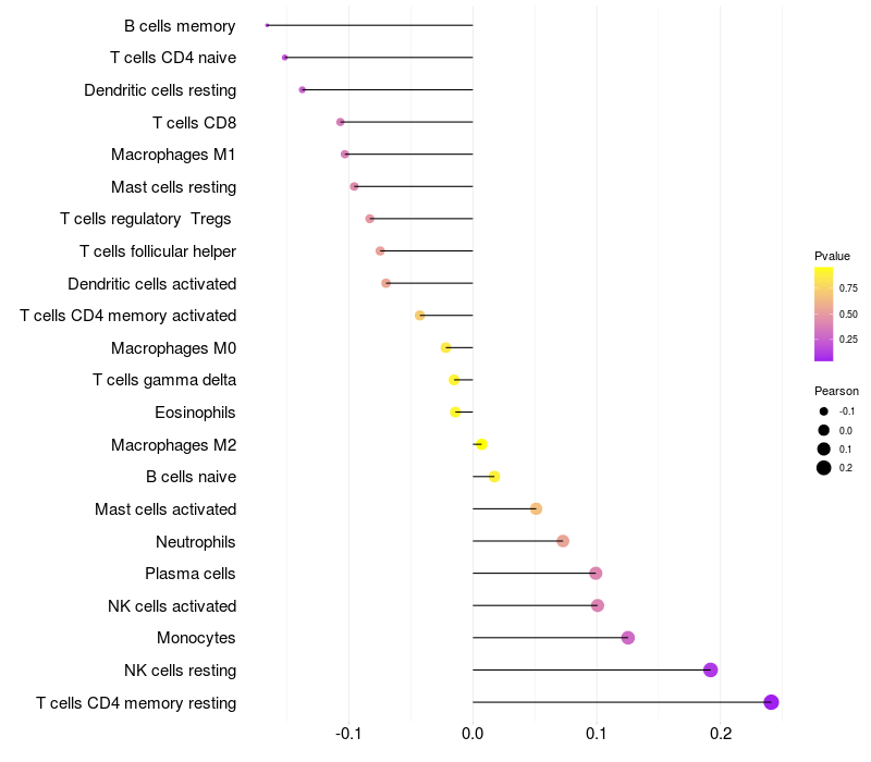 Lollipop of NR4A2 expression and immune infiltrating cell level correlation result in HPV+ samples