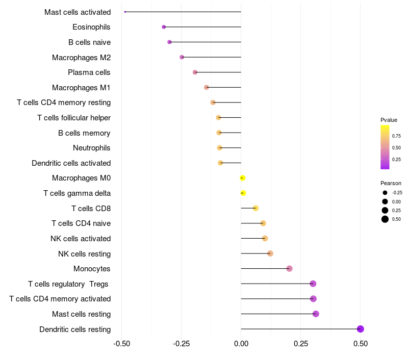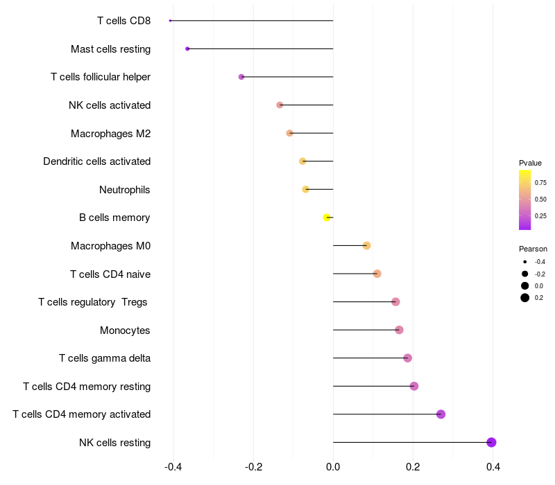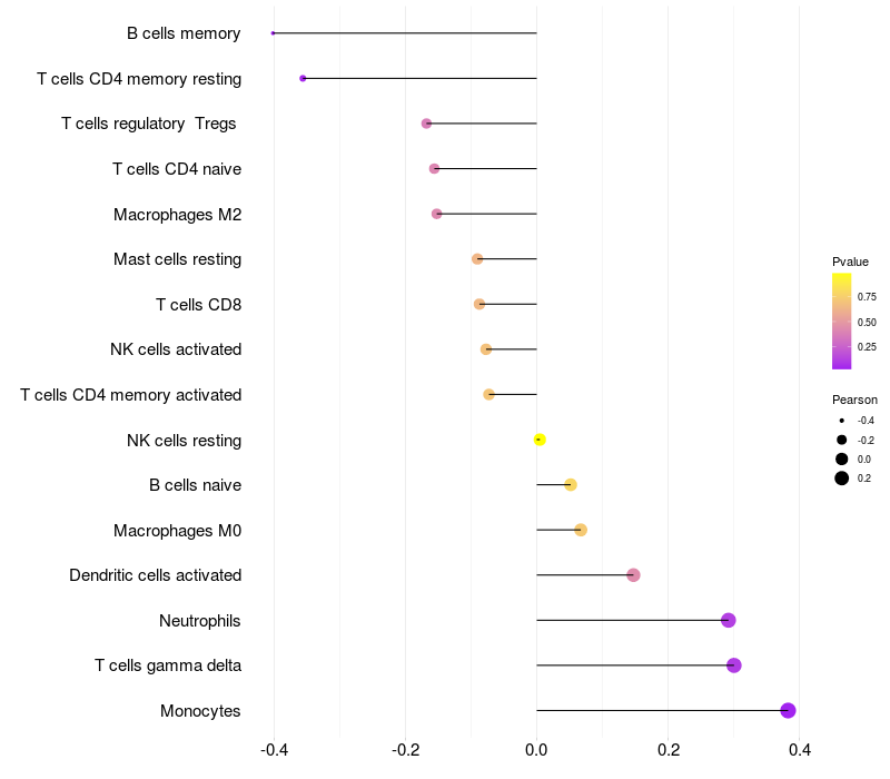 Lollipop of NRAP expression and immune infiltrating cell level correlation result in HTLV1+ samples