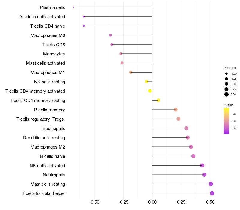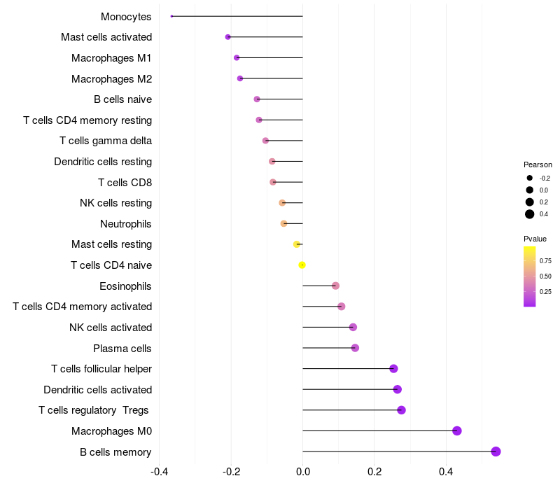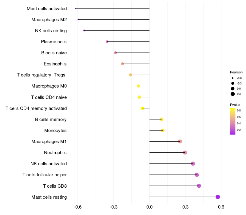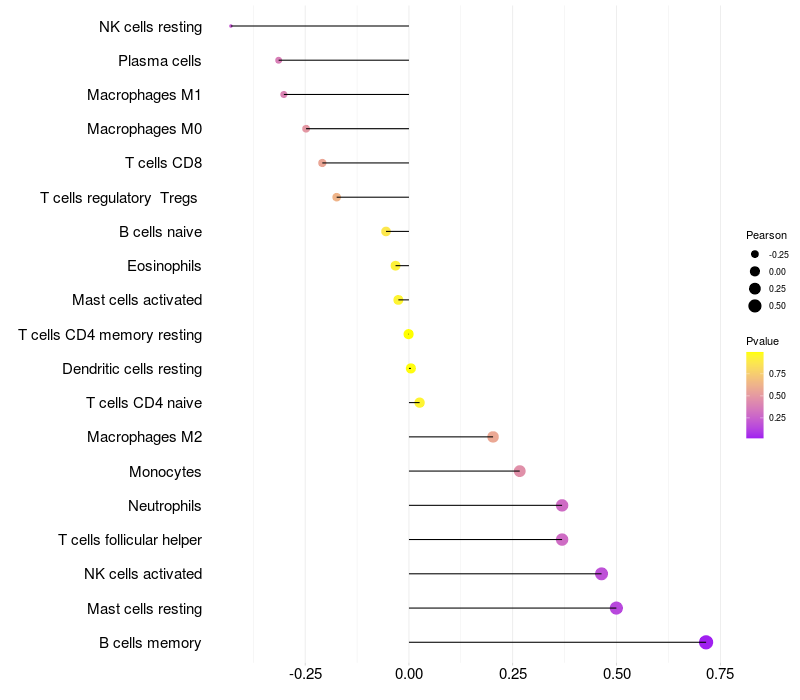 Lollipop of NRF1 expression and immune infiltrating cell level correlation result in HBV+ Liver cirrhosis samples