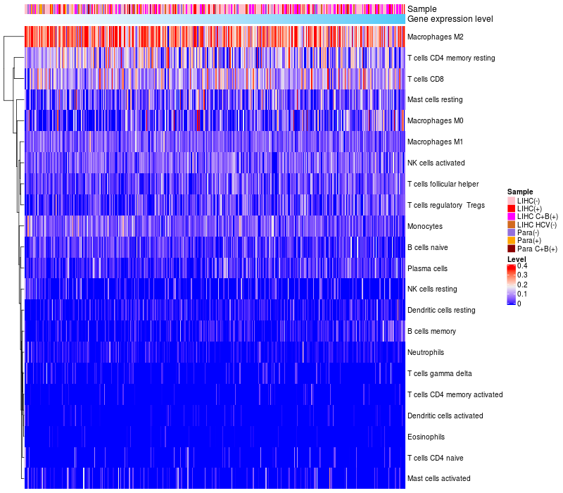 Liver hepatocellular carcinoma HCV (HBV+)(86), Liver hepatocellular carcinoma HCV (HBV-)(19), Liver hepatocellular carcinoma (HBV+)(209), Liver hepatocellular carcinoma (HBV+)(60), Paracancerous HCV (HBV+)(4), Paracancerous (HBV-)(28), Paracancerous (HBV+)(18) |