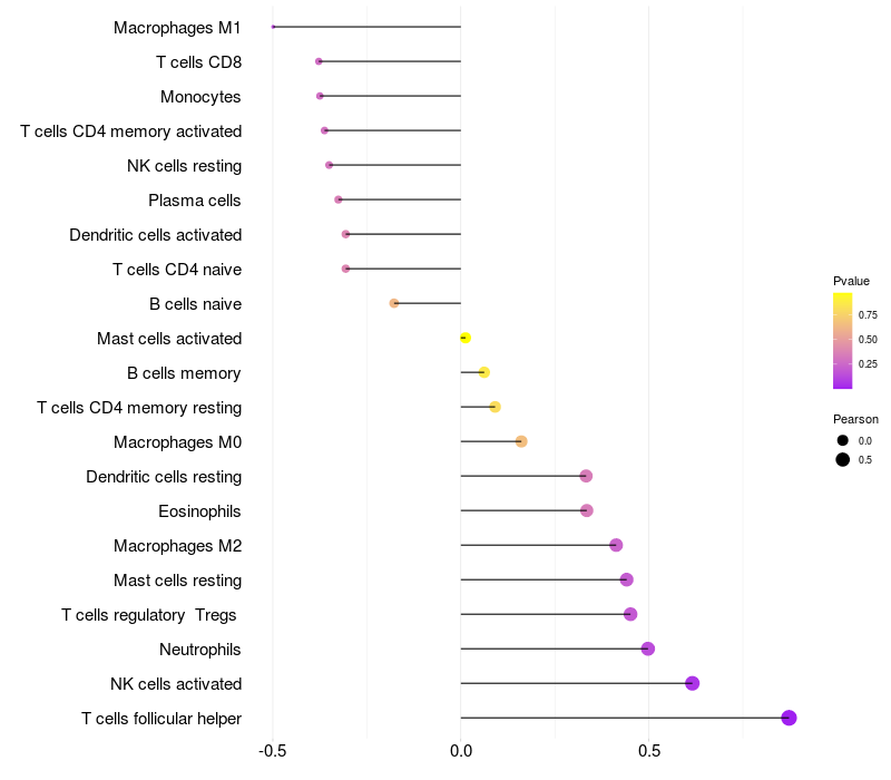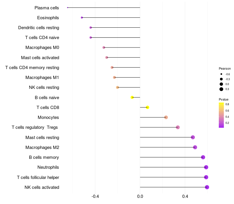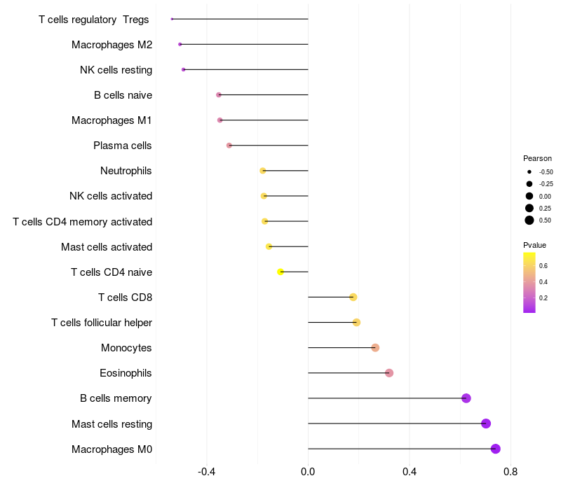 Lollipop of NRG1 expression and immune infiltrating cell level correlation result in HBV+ Liver cirrhosis samples