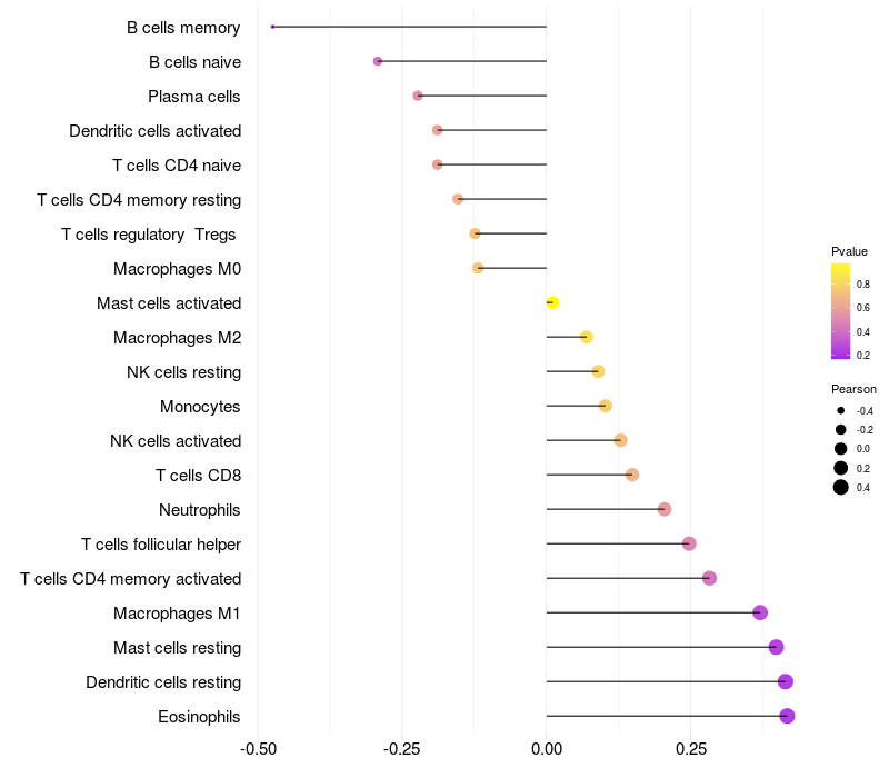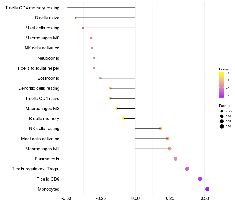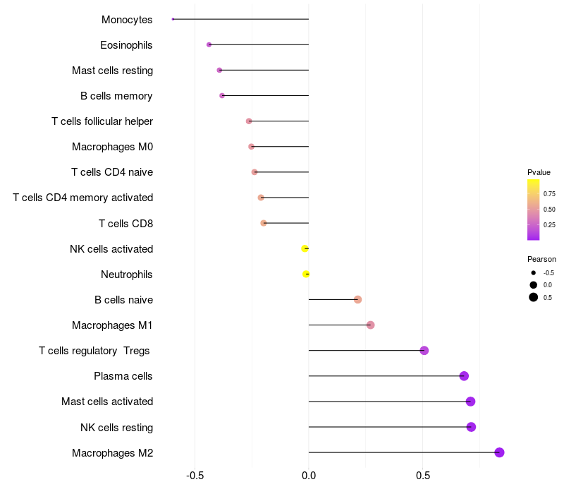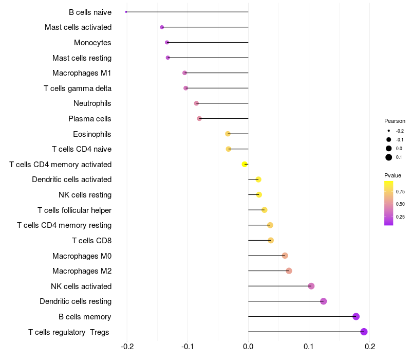 Lollipop of NRG2 expression and immune infiltrating cell level correlation result in HBV+ Liver cirrhosis samples