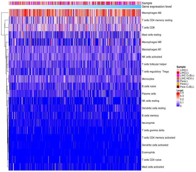 Liver hepatocellular carcinoma HCV (HBV+)(86), Liver hepatocellular carcinoma HCV (HBV-)(19), Liver hepatocellular carcinoma (HBV+)(209), Liver hepatocellular carcinoma (HBV+)(60), Paracancerous HCV (HBV+)(4), Paracancerous (HBV-)(28), Paracancerous (HBV+)(18) |