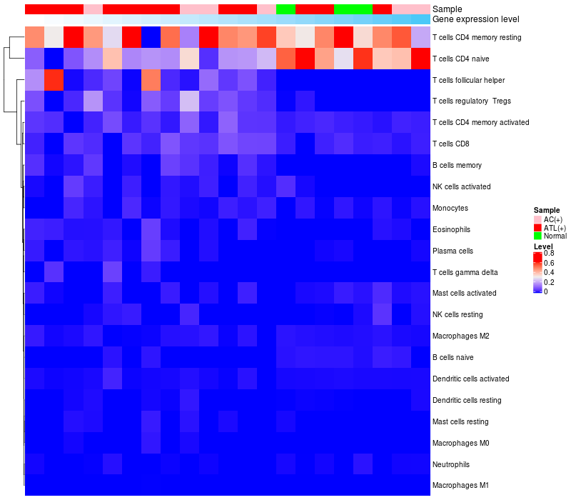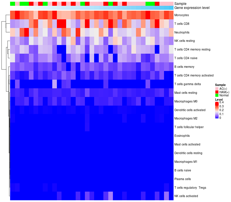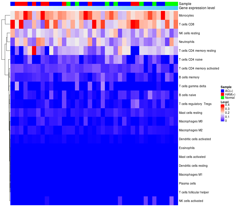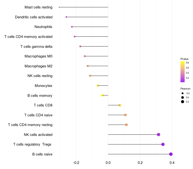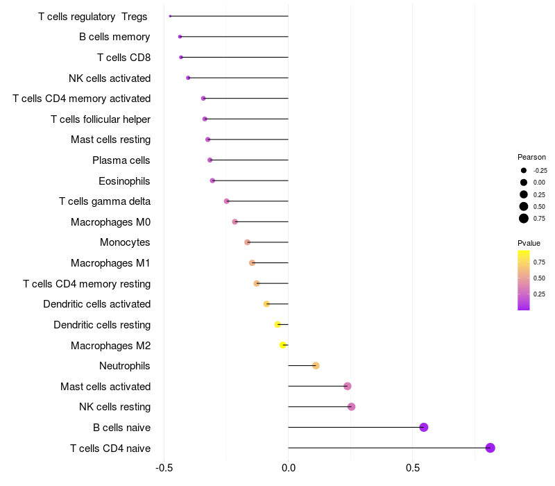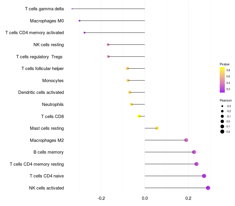 Lollipop of NRIP1 expression and immune infiltrating cell level correlation result in HTLV1+ samples