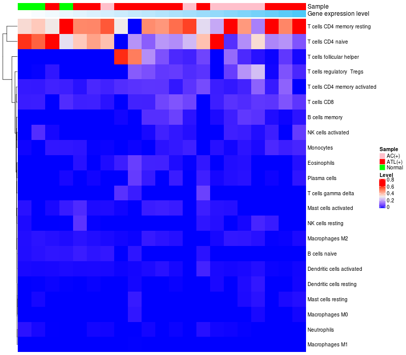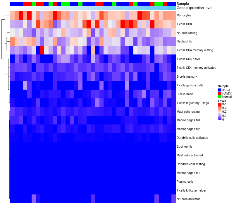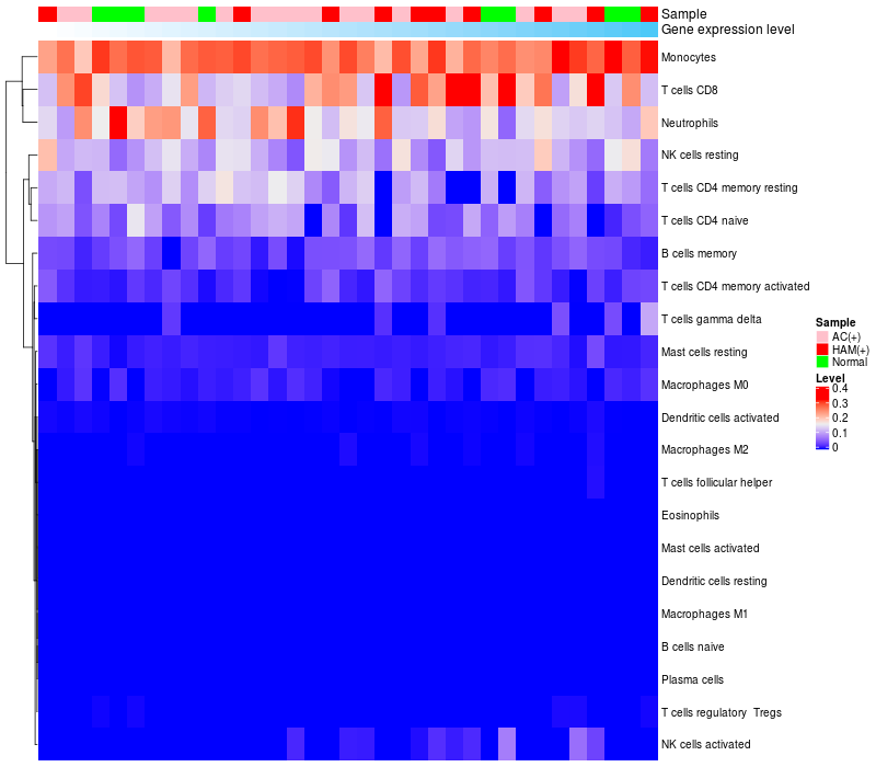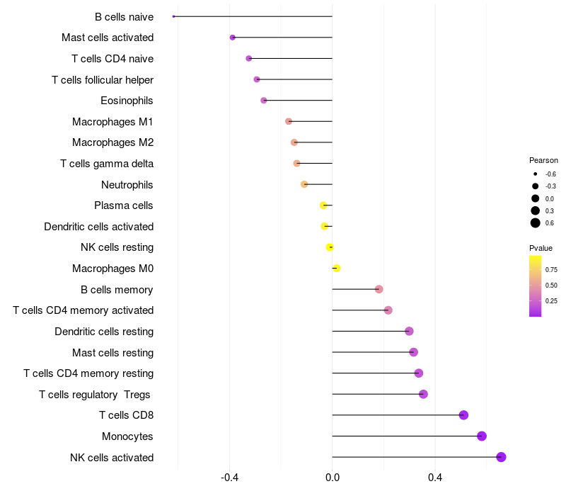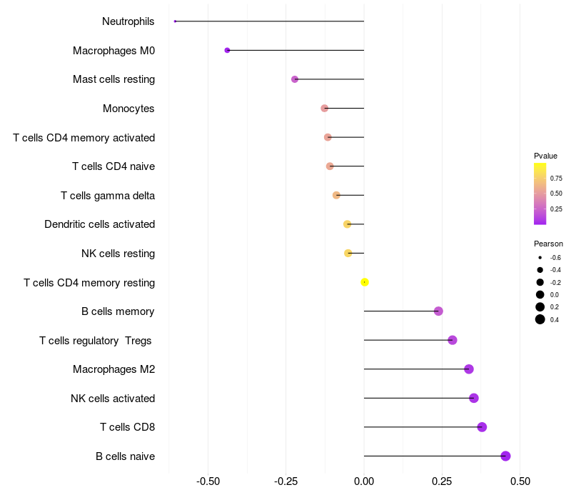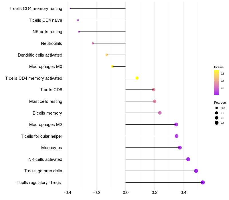 Lollipop of NUBP1 expression and immune infiltrating cell level correlation result in HTLV1+ samples