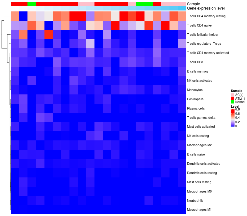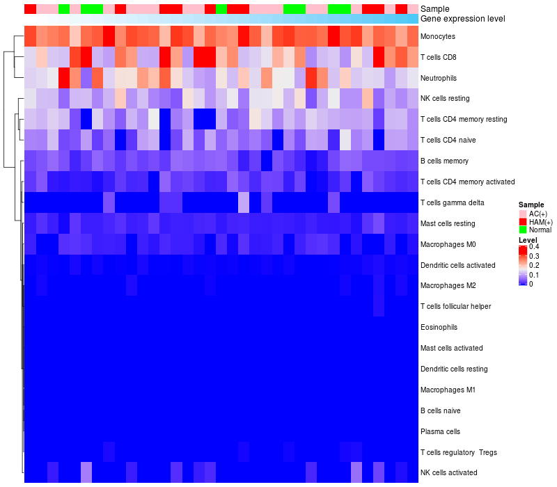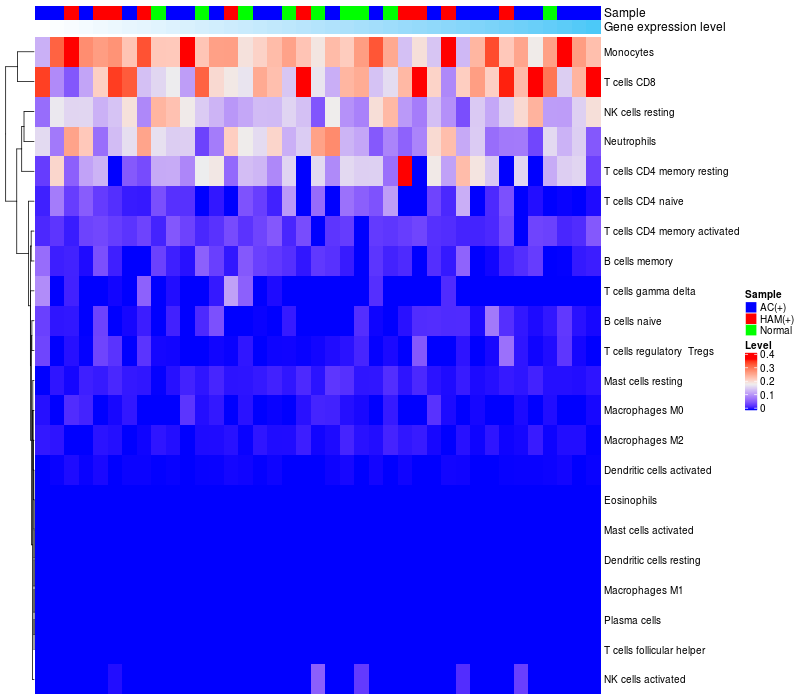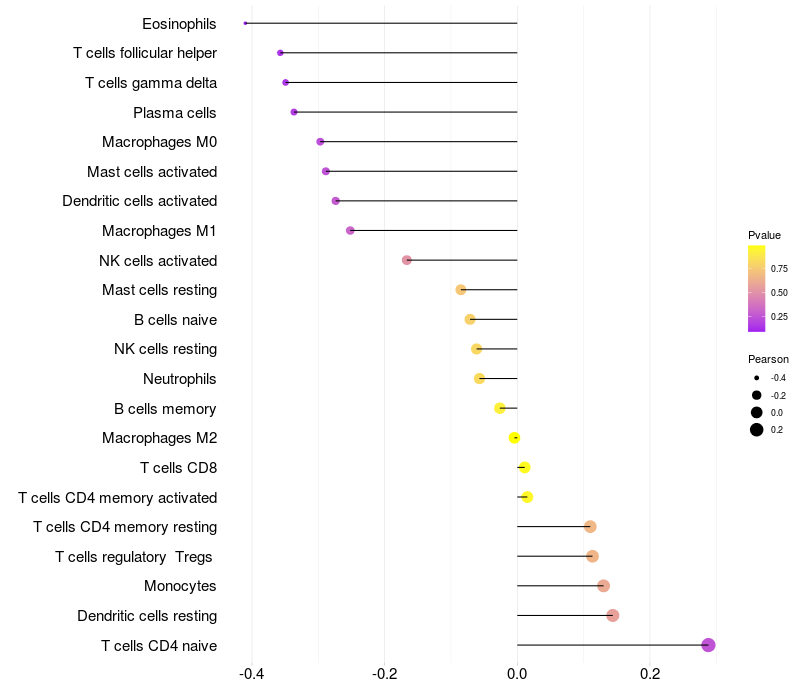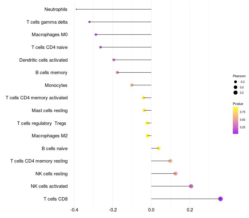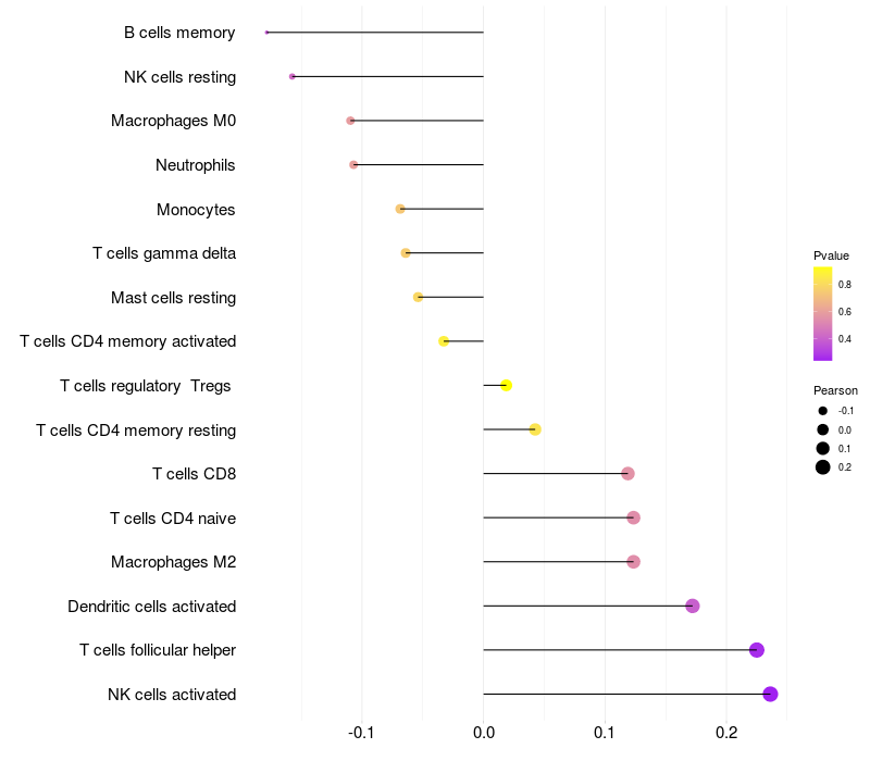 Lollipop of NUDCD1 expression and immune infiltrating cell level correlation result in HTLV1+ samples