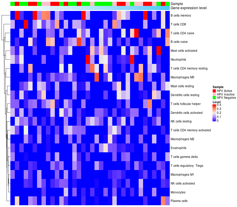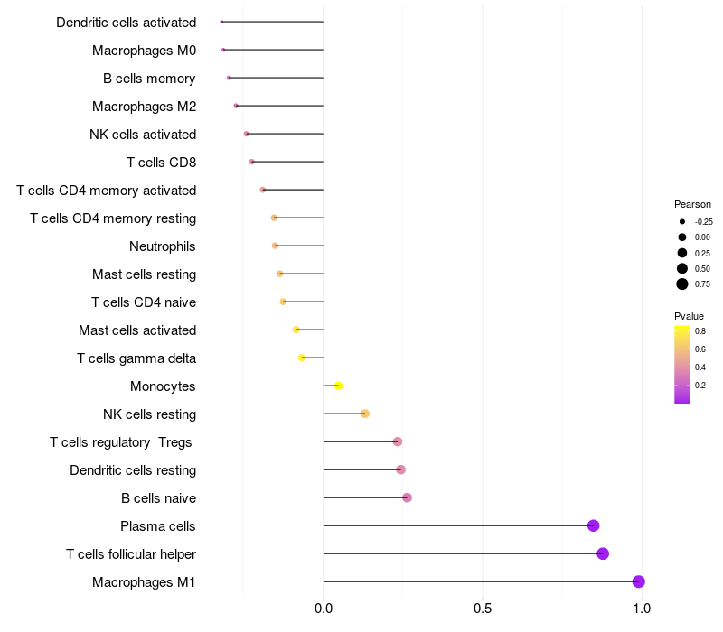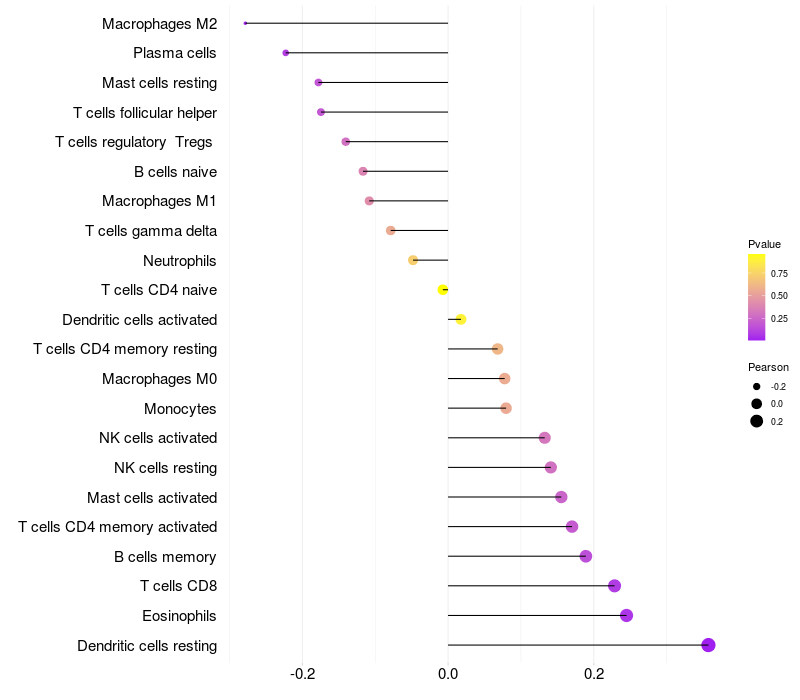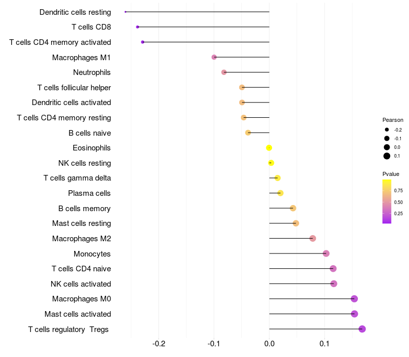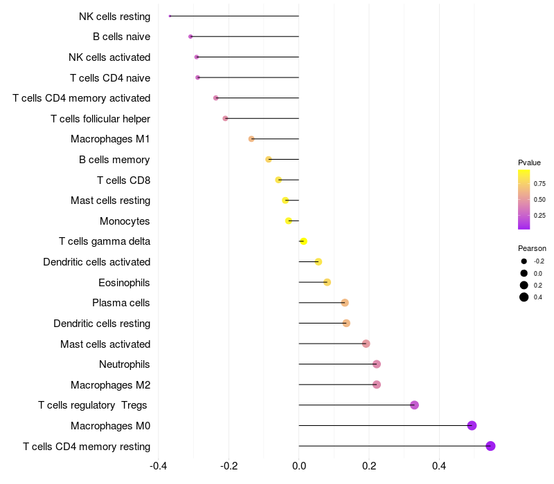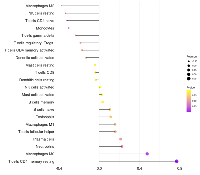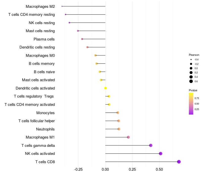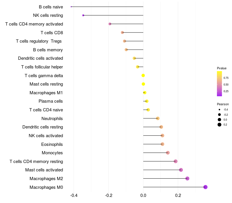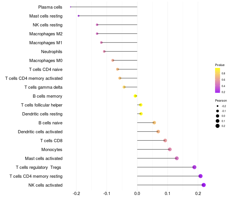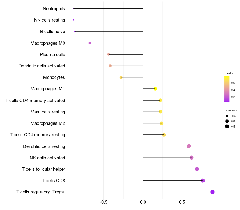 Lollipop of NUDT10 expression and immune infiltrating cell level correlation result in HPV+ samples