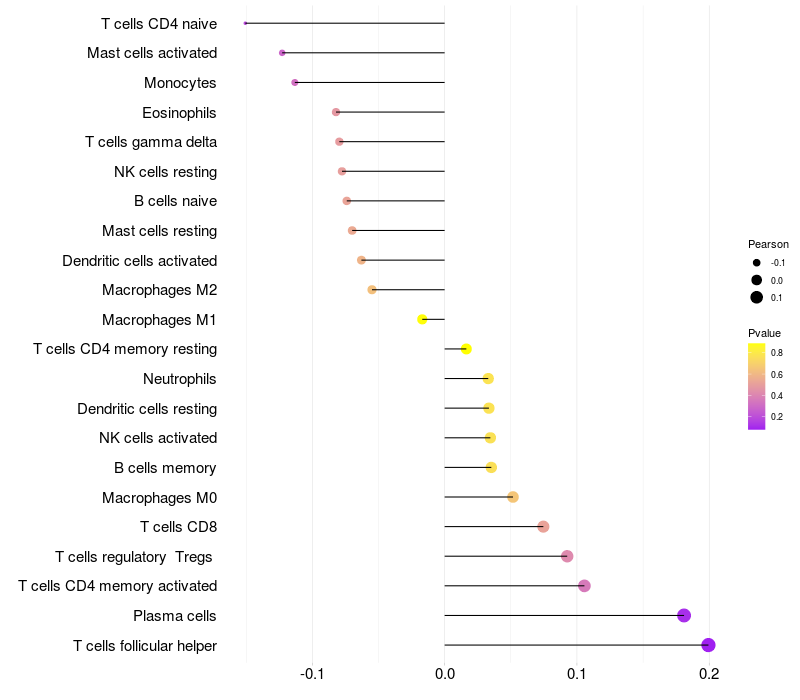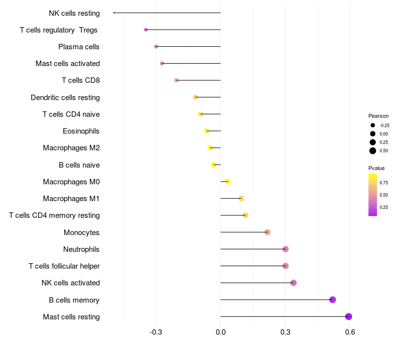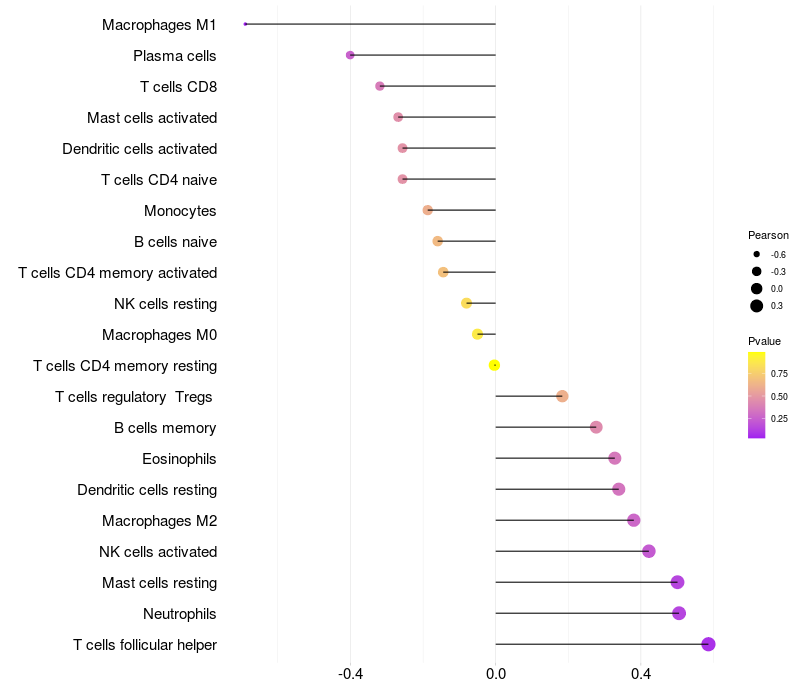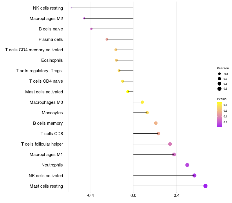 Lollipop of NUP214 expression and immune infiltrating cell level correlation result in HBV+ Liver cirrhosis samples