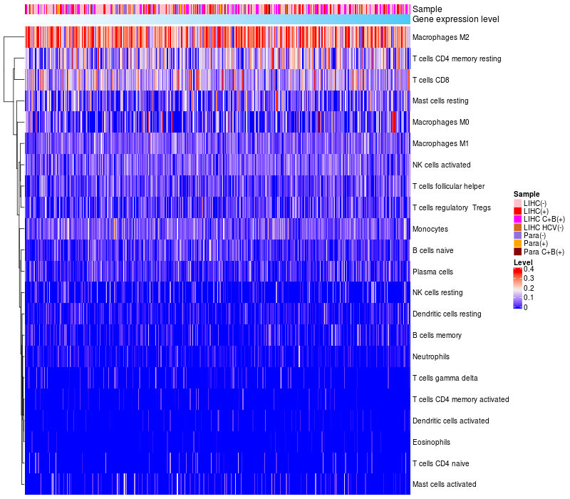 Liver hepatocellular carcinoma HCV (HBV+)(86), Liver hepatocellular carcinoma HCV (HBV-)(19), Liver hepatocellular carcinoma (HBV+)(209), Liver hepatocellular carcinoma (HBV+)(60), Paracancerous HCV (HBV+)(4), Paracancerous (HBV-)(28), Paracancerous (HBV+)(18) |
