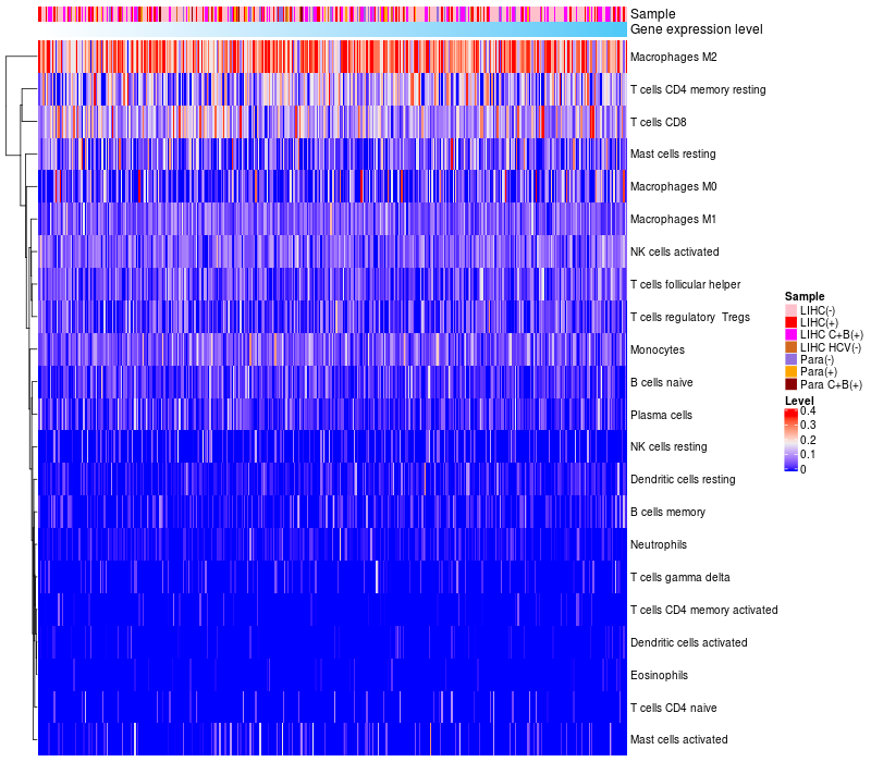 Liver hepatocellular carcinoma HCV (HBV+)(86), Liver hepatocellular carcinoma HCV (HBV-)(19), Liver hepatocellular carcinoma (HBV+)(209), Liver hepatocellular carcinoma (HBV+)(60), Paracancerous HCV (HBV+)(4), Paracancerous (HBV-)(28), Paracancerous (HBV+)(18) |