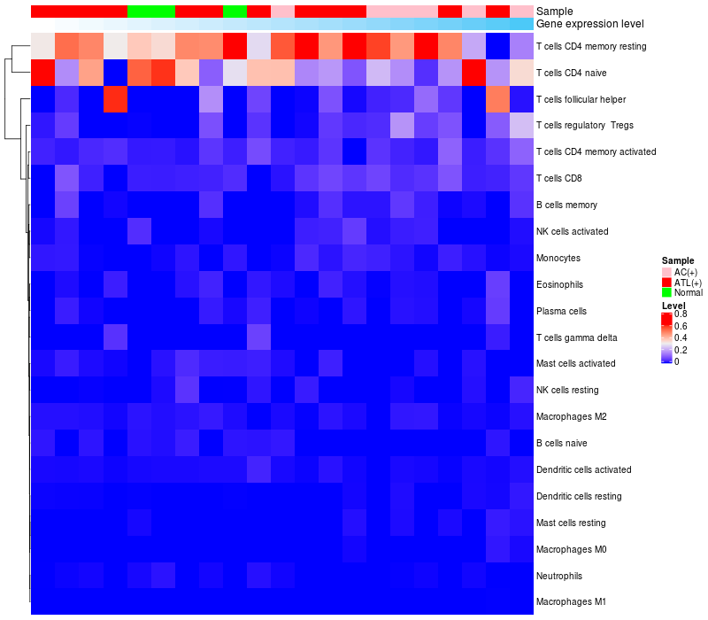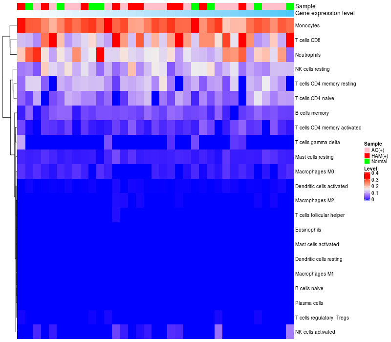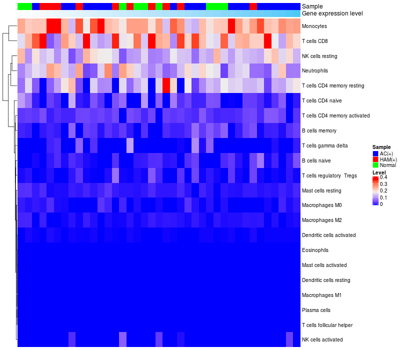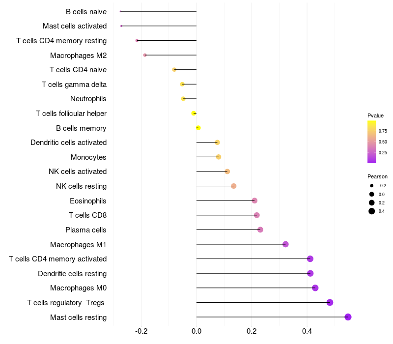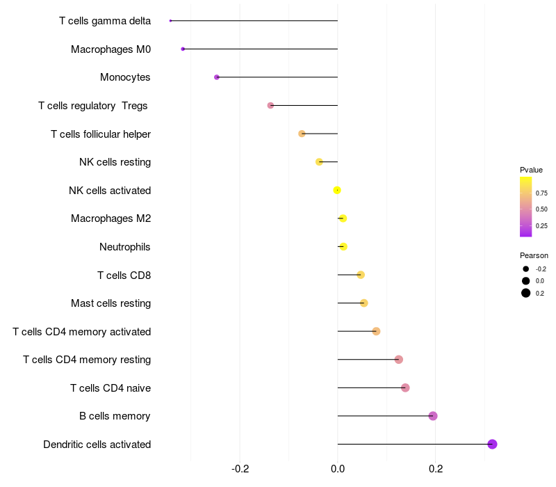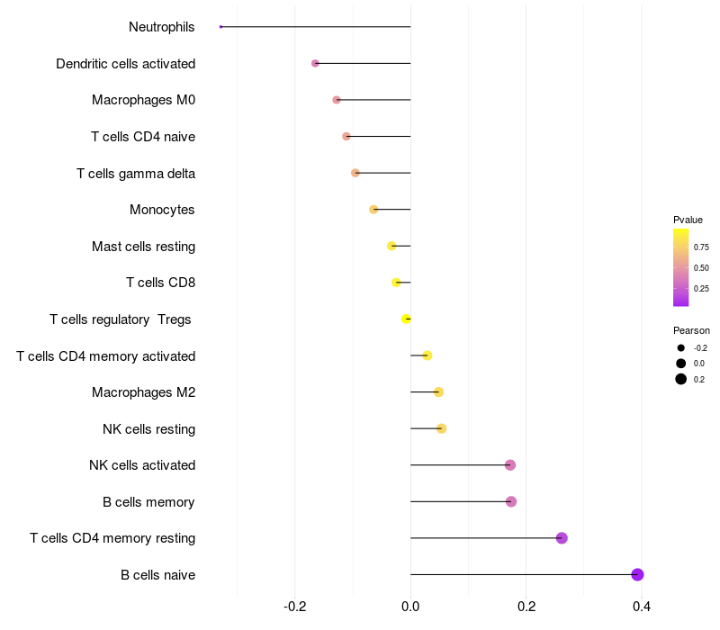 Lollipop of NUTF2 expression and immune infiltrating cell level correlation result in HTLV1+ samples
