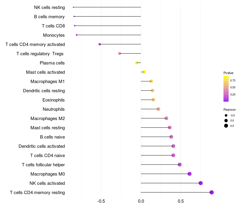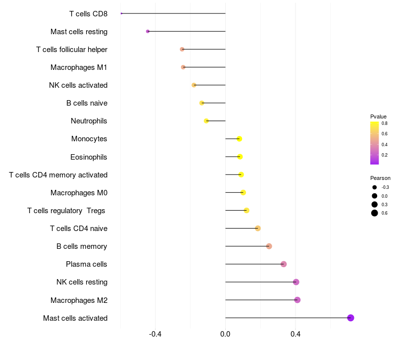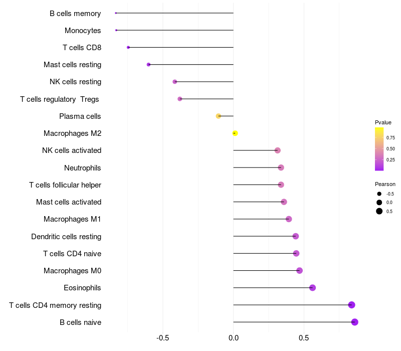 Lollipop of NXN expression and immune infiltrating cell level correlation result in HBV+ Liver cirrhosis samples