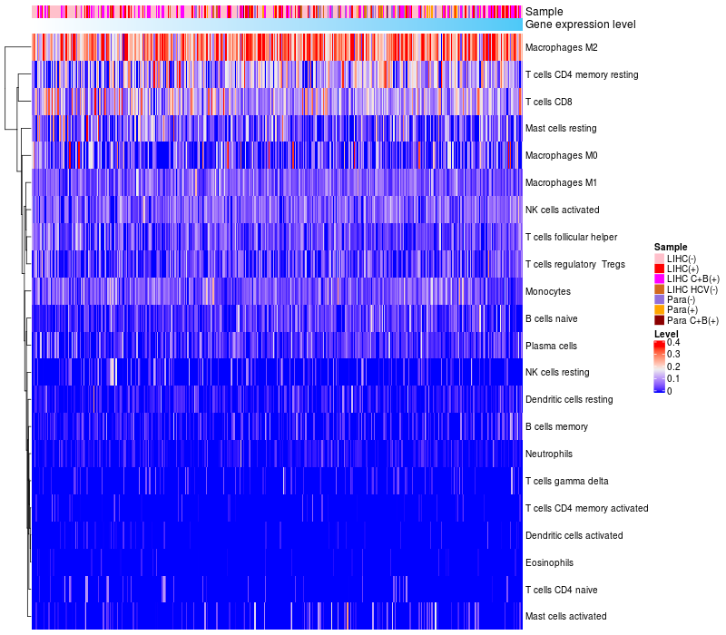 Liver hepatocellular carcinoma HCV (HBV+)(86), Liver hepatocellular carcinoma HCV (HBV-)(19), Liver hepatocellular carcinoma (HBV+)(209), Liver hepatocellular carcinoma (HBV+)(60), Paracancerous HCV (HBV+)(4), Paracancerous (HBV-)(28), Paracancerous (HBV+)(18) |
