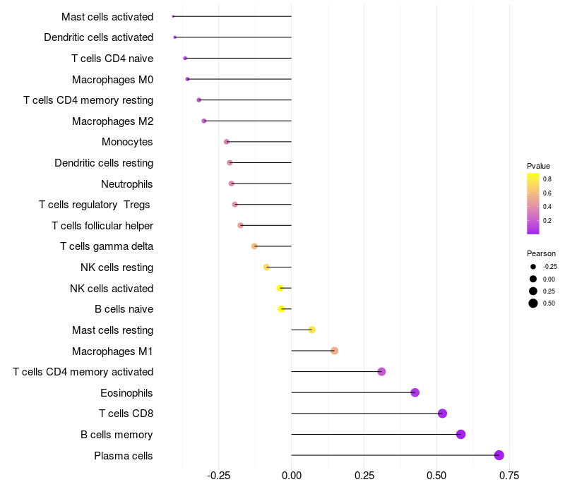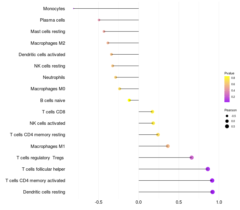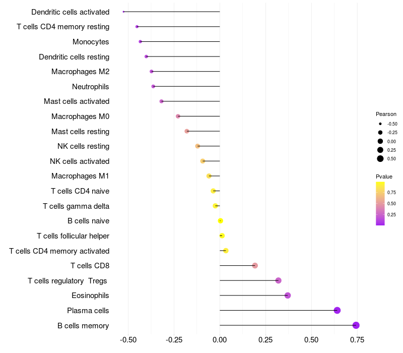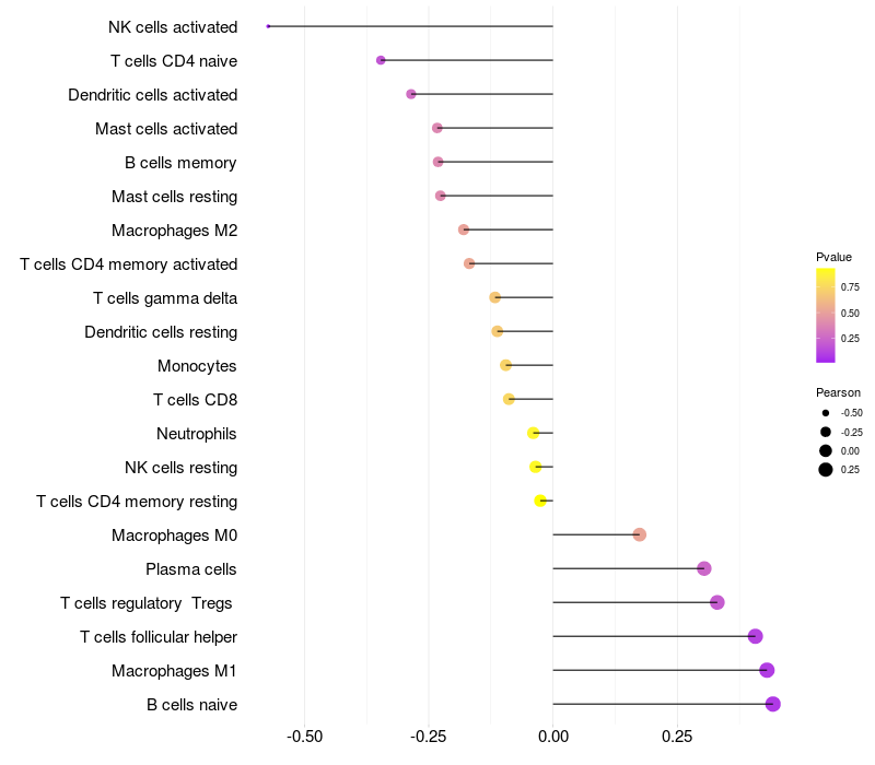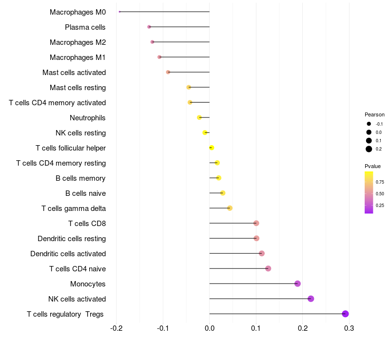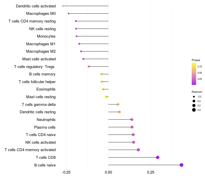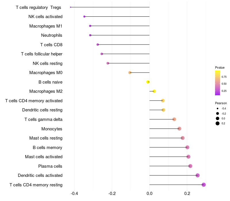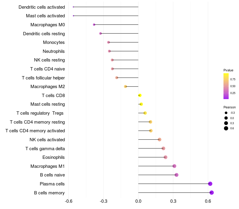 Lollipop of NYX expression and immune infiltrating cell level correlation result in HPV+ samples