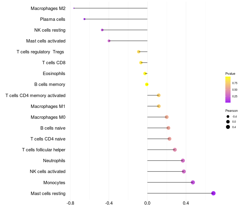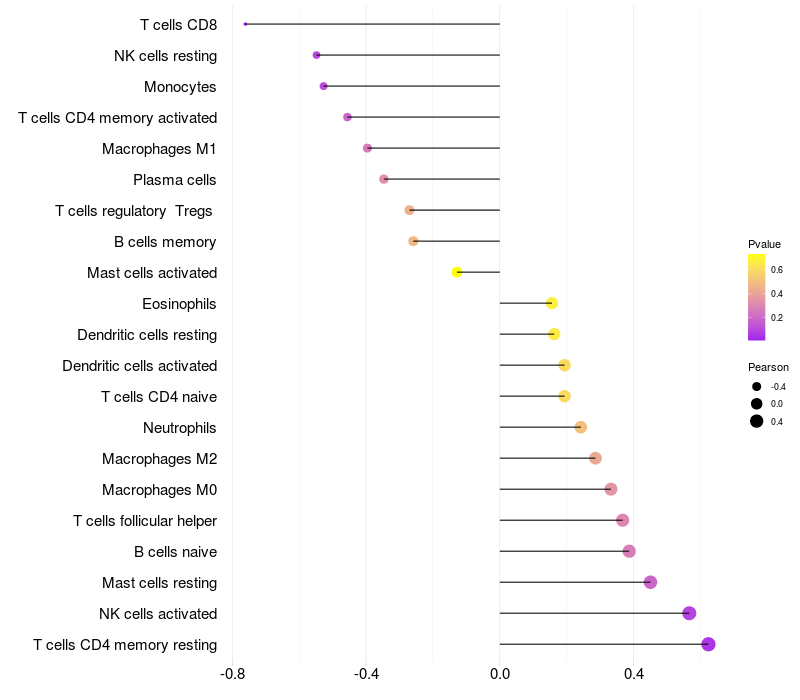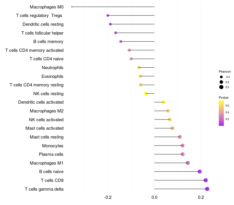 Lollipop of OAZ2 expression and immune infiltrating cell level correlation result in HBV+ Liver cirrhosis samples